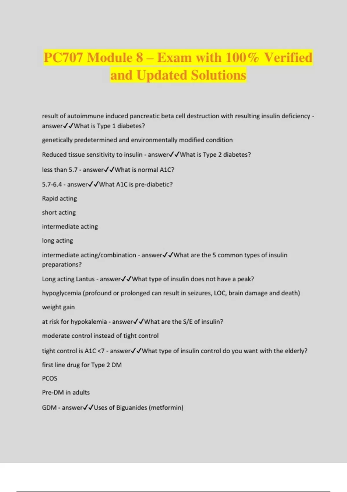 PC707 Module 8 – Exam with 100% Verified and Updated Solutions result of autoimmune induced pancreatic beta cell destruction with resulting insulin deficiency - answerWhat is Type 1 diabetes? genetically predetermined and environmentally modified condition Reduced tissue sensitivity to insulin - answerWhat is Type 2 diabetes? less than 5.7 - answerWhat is normal A1C? 5.7-6.4 - answerWhat A1C is pre-diabetic? Rapid acting short acting intermediate acting long acting intermediate acting/combination - answerWhat are the 5 common types of insulin preparations? Long acting Lantus - answerWhat type of insulin does not have a peak? hypoglycemia (profound or prolonged can result in seizures, LOC, brain damage and death) weight gain at risk for hypokalemia - answerWhat are the S/E of insulin? moderate control instead of tight control tight control is A1C <7 - answerWhat type of insulin control do you want with the elderly? first line drug for Type 2 DM PCOS Pre-DM in adults GDM - answerUses of Biguanides (metformin) decreases hepatic glucose production, decreasing intestinal absorption of glucose and improves insulin sensitivity (increases peripheral glucose uptake and utilization) - answerMOA of biguanides (metformin) a rare problem is lactic acidosis- serious lactic acid accumulation - answerWhat is the black box warning for the biguanide metformin? most common are GI (metallic taste in mouth, mild anorexia, nausea, abdominal discomfort, diarrhea) malaise myalgia respiratory distress somnolence abdominal distress - answerS/E of the biguanide metformin severe renal disease (eGFR < 30 ml) acute or chronic metabolic acidosis including diabetic ketoacidosis with or without coma hypersensitivity to metformin - answerContraindications of biguanide metformin tagamet- causing an increase in metformin blood levels sulfonylurea or insulin- can increase the risk of hypoglycemia can increase the risk of lactic acidosis in those with impaired renal function - answerWhat D2D interactions can you see with metformin? renal function (eGFR) prior to therapy initiation and at least annually- more often in patients at risk of developing renal impairment - answerWhat specific monitoring parameters are there with metformin before any radiologic procedure involving the administration of iodinated contrast material in the blood. May need to hold metformin for 48 hours after administration of IV contrast. Reevaluate eGFR in 48 hours, if stable restart metformin - answerWhat would be a reason to discontinue metformin