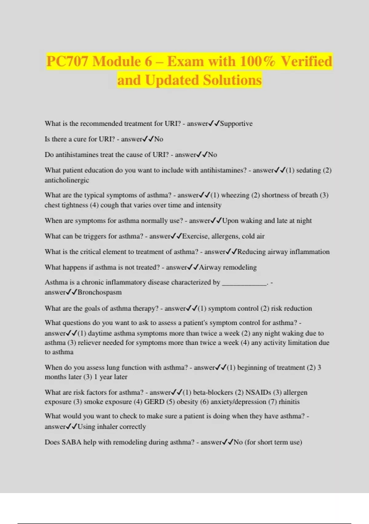 PC707 Module 6 – Exam with 100% Verified and Updated Solutions What is the recommended treatment for URI? - answerSupportive Is there a cure for URI? - answerNo Do antihistamines treat the cause of URI? - answerNo What patient education do you want to include with antihistamines? - answer(1) sedating (2) anticholinergic What are the typical symptoms of asthma? - answer(1) wheezing (2) shortness of breath (3) chest tightness (4) cough that varies over time and intensity When are symptoms for asthma normally use? - answerUpon waking and late at night What can be triggers for asthma? - answerExercise, allergens, cold air What is the critical element to treatment of asthma? - answerReducing airway inflammation What happens if asthma is not treated? - answerAirway remodeling Asthma is a chronic inflammatory disease characterized by ____________. - answerBronchospasm What are the goals of asthma therapy? - answer(1) symptom control (2) risk reduction What questions do you want to ask to assess a patient's symptom control for asthma? - answer(1) daytime asthma symptoms more than twice a week (2) any night waking due to asthma (3) reliever needed for symptoms more than twice a week (4) any activity limitation due to asthma When do you assess lung function with asthma? - answer(1) beginning of treatment (2) 3 months later (3) 1 year later What are risk factors for asthma? - answer(1) beta-blockers (2) NSAIDs (3) allergen exposure (3) smoke exposure (4) GERD (5) obesity (6) anxiety/depression (7) rhinitis What would you want to check to make sure a patient is doing when they have asthma? - answerUsing inhaler correctly Does SABA help with remodeling during asthma? - answerNo (for short term use) What should you consider with ICS if their asthma has been well-controlled for 3 months? - answerStep down Is ICS a resuce inhaler? - answerNo (maintenance) What should a person do after taking an ICS inhaler? - answerRinse out mouth with water T/F When treating a patient with asthma, knowing the patient's baseline peak flow is important, as it serves as a guide to illness severity when a patient becomes ill? - answerTRUE T/F When designing an asthma action plan, the green, yellow, and red are predetermined based on a person's age & gender compared to the national average? - answerFALSE T/F The inhaled steroids help to lessen the occurrence of airway remodeling in asthma? - answerTRUE Is this stable, well-controlled asthma? Daytime symptoms are twice per week or less, rescue medications are twice per week or less, there are not nocturnal symptoms or limitations in activities, and there is normal lung function. - answerYes T/F Asthma related deaths occur when patients try to treat acute symptoms with drugs intended for maintenance therapy, instead of rescue drugs? - answerTRUE T/F Albuterol (short-acting beta-2 adrenergic agonist), as a rescue drug may be given either through an MDI or through a nebulizer? - answerTRUE T/F In asthma, the LABAs are used to achieve sustained bronchodilation and are classified as monotherapy agents? - answerFALSE What is the classification of LABA drugs and what should they be used with? - answerMaintenance therapy and corticosteroids T/F In asthma, inhaled glucocorticoids are the mainstay of asthma therapy? - answerTRUE When prescribing singular (leukotriene antagonists), educate patients and their caregivers about the need to contact their provider and stop the medication if the following occurs? - answer(1) aggressive behavior or hostility (2) dream abnormalities, hallucinations, or insomnia (3) suicidal thoughts or ideations T/F LABAS exert long-term bronchodilation in COPD? - answerTRUE LAMAS help with COPD in what 3 ways? - answer(1) bronchodilator (2) decrease inflammation (3) dry up secretions Is the asthma action plan individual? - answerYe