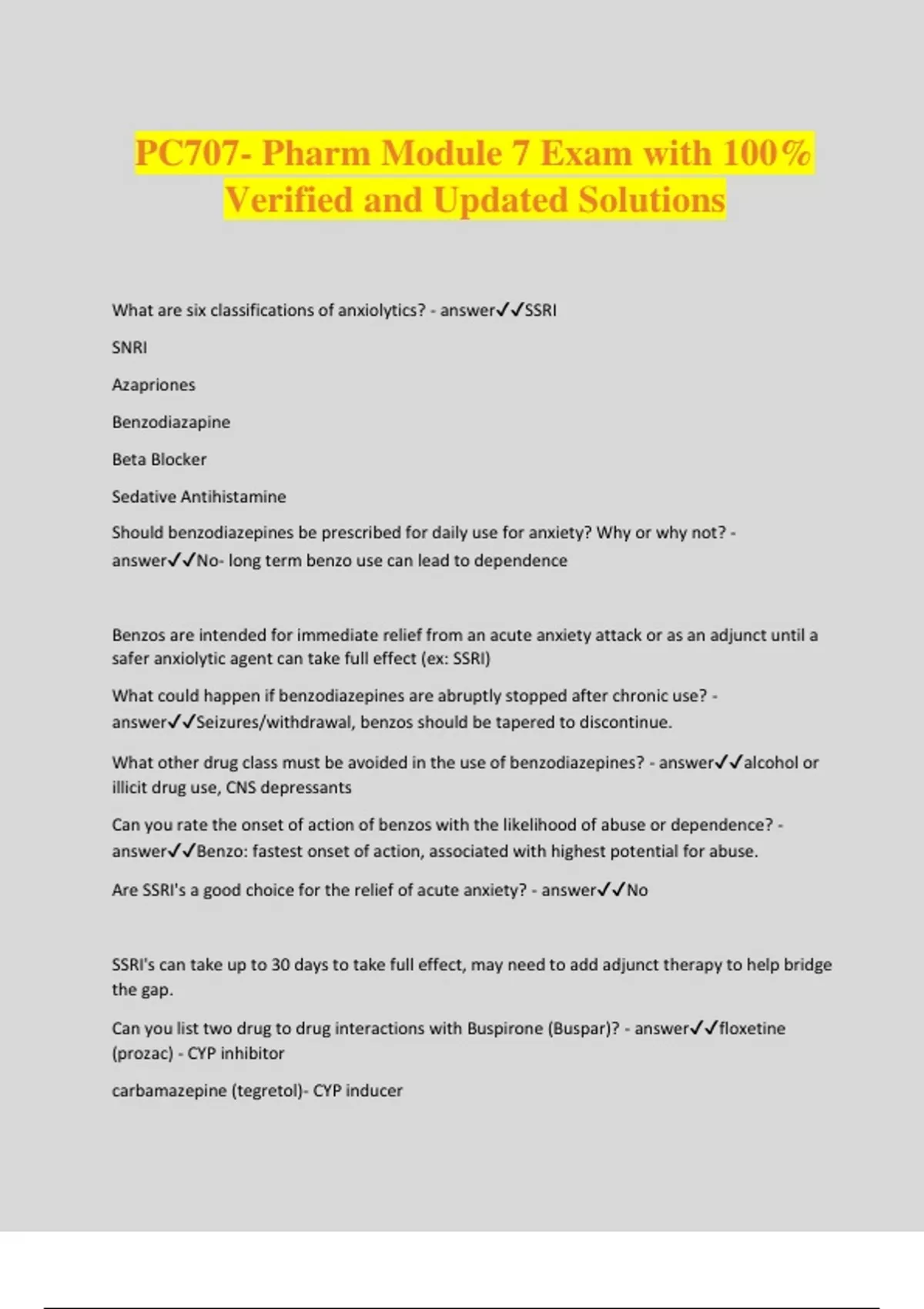 PC707- Pharm Module 7 Exam with 100% Verified and Updated Solutions What are six classifications of anxiolytics? - answerSSRI SNRI Azapriones Benzodiazapine Beta Blocker Sedative Antihistamine Should benzodiazepines be prescribed for daily use for anxiety? Why or why not? - answerNo- long term benzo use can lead to dependence Benzos are intended for immediate relief from an acute anxiety attack or as an adjunct until a safer anxiolytic agent can take full effect (ex: SSRI) What could happen if benzodiazepines are abruptly stopped after chronic use? - answerSeizures/withdrawal, benzos should be tapered to discontinue. What other drug class must be avoided in the use of benzodiazepines? - answeralcohol or illicit drug use, CNS depressants Can you rate the onset of action of benzos with the likelihood of abuse or dependence? - answerBenzo: fastest onset of action, associated with highest potential for abuse. Are SSRI's a good choice for the relief of acute anxiety? - answerNo SSRI's can take up to 30 days to take full effect, may need to add adjunct therapy to help bridge the gap. Can you list two drug to drug interactions with Buspirone (Buspar)? - answerfloxetine (prozac) - CYP inhibitor carbamazepine (tegretol)- CYP inducer What is the abuse potential when using hydroxyzine (Vistaril) in the treatment of anxiety? - answerno abuse or addiction concerns ** can have anticholingeric side effects** Which patients should avoid the use of hydroxyzine (Vistaril)? - answerelderly or those that could have exacerbated anticholingeric effects How do Beta- Blockers work to reduce anxiety related to public speaking? - answerBlock beta 1 and beta 1 adrenergic stimulation in the heart (induced by epinephrine and norepinephrine), relieves the catecholamine-mediated autonomic symptoms (fight or flight) without sedation. Who should avoid Beta-Blockers? - answerindividuals with cardiac history or who are already taking a beta blocker Can you list drug-to-drug interactions associated with St. John's Wort? - answerSSRI triptans Benzodiazapine Contraceptives Some abx Digoxin What are two agents recommended in the treatment of chronic insomnia? - answerLunesta (eszopiclone) Rozerem (ramelteon) Discuss the required patient education that must be provided regarding sleep medications. - answer- Do not take unless you have 7-8 hours to sleep - Take on a empty stomach 30 minutes before bed - Longer half life (eszopiclone- Lunesta) is associated with next day impairment - sleep walking, sleep driving, sleep eating, sleep sex have been reported with zolpidem and other "z drugs" - Do not combine with other CNS depressants or alcohol Which anxiolytics are considered safe in pregnancy? - answerbuspirone- cat b, but avoid d/t limited data vistaril- cat c, approved for short term use with anxiety, insomnia, or exhaustion secondary to prodromal labor ambien- cat c, last resort for short term therapy lexapro?- cat c Which sleep medications are considered safe in pregnancy? - answerambien- short term, last resort vistaril- safe in pregnancy What sleep medicine should be avoided in pregnancy? - answermelatonin Antidepressant MOA: SSRI - answerblocks the reuptake of serotonin --> increased serotonin in the synapse = overall increase in serotonin Antidepressant MOA: SNRI - answerboost serotonin and norepinephrine by blocking reuptake Antidepressant MOA: TCA - answerblock reuptake of serotonin and norepinephrine, increasing concentration at CNS synapse Antidepressant MOA: MAOI - answerinhibits MAO at nerve terminal (enzyme that breaks down serotonin and norepinephrine) --> increase serotonin and norepinephrine available for release Antidepressant MOA: Buproprion - answerblock dopamine and norepinephrine reuptake --> boosts NE and dopamine concentration. How long does it take to see the initial response with antidepressants? How long for the full effect of antidepressants? - answerSSRI's can take 2-4 weeks What are two determinants for which antidepressant to use? Are there any others? - answertwo determinants: tolerability and safety other considerations: drug interactions, patie