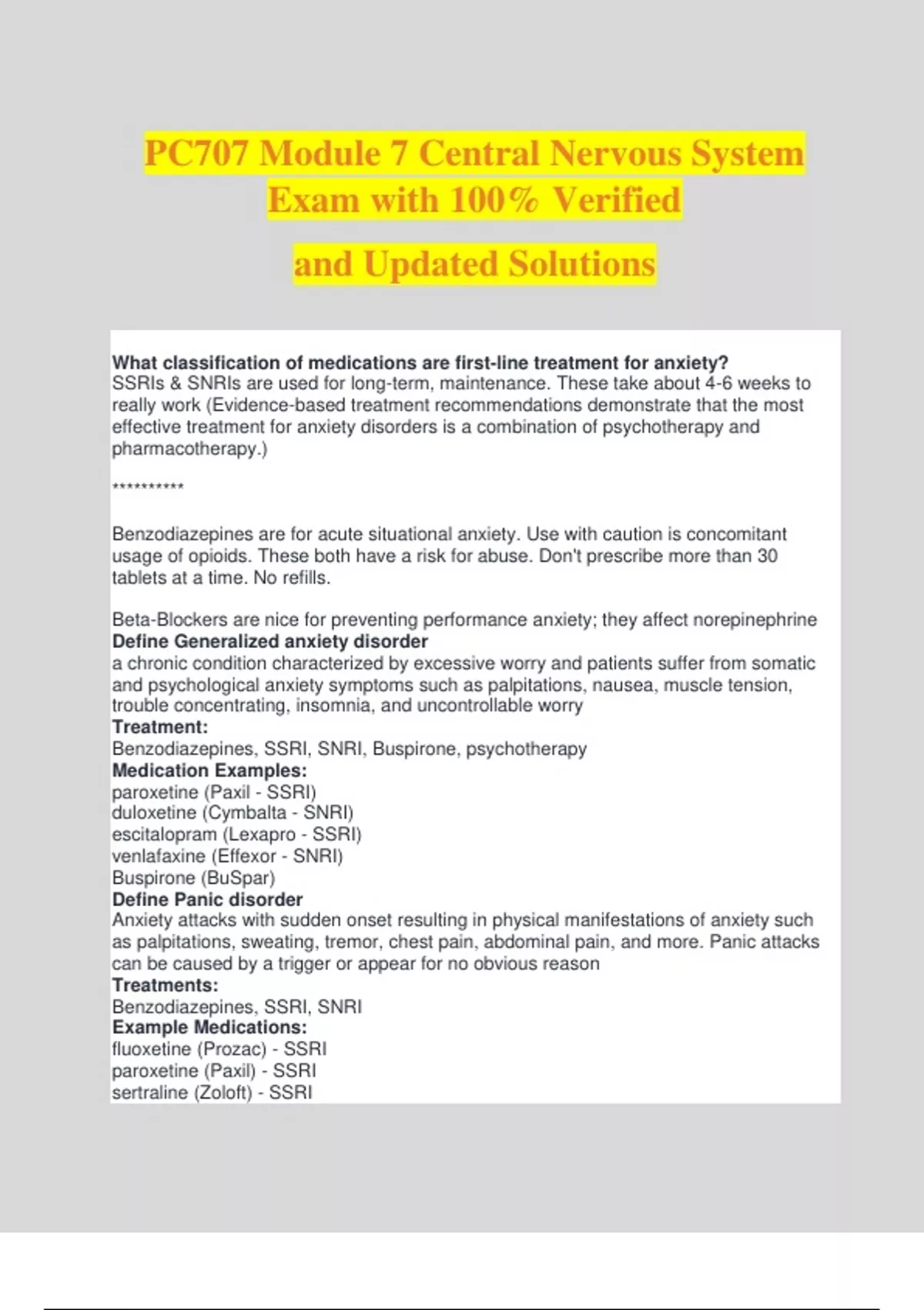 PC707 Module 7 Central Nervous System Exam with 100% Verified and Updated Solutions What classification of medications are first-line treatment for anxiety? SSRIs & SNRIs are used for long-term, maintenance. These take about 4-6 weeks to really work (Evidence-based treatment recommendations demonstrate that the most effective treatment for anxiety disorders is a combination of psychotherapy and pharmacotherapy.) ********** Benzodiazepines are for acute situational anxiety. Use with caution is concomitant usage of opioids. These both have a risk for abuse. Don't prescribe more than 30 tablets at a time. No refills. Beta-Blockers are nice for preventing performance anxiety; they affect norepinephrine Define Generalized anxiety disorder a chronic condition characterized by excessive worry and patients suffer from somatic and psychological anxiety symptoms such as palpitations, nausea, muscle tension, trouble concentrating, insomnia, and uncontrollable worry Treatment: Benzodiazepines, SSRI, SNRI, Buspirone, psychotherapy Medication Examples: paroxetine (Paxil - SSRI) duloxetine (Cymbalta - SNRI) escitalopram (Lexapro - SSRI) venlafaxine (Effexor - SNRI) Buspirone (BuSpar) Define Panic disorder Anxiety attacks with sudden onset resulting in physical manifestations of anxiety such as palpitations, sweating, tremor, chest pain, abdominal pain, and more. Panic attacks can be caused by a trigger or appear for no obvious reason Treatments: Benzodiazepines, SSRI, SNRI Example Medications: fluoxetine (Prozac) - SSRI paroxetine (Paxil) - SSRI sertraline (Zoloft) - SSRI venlafaxine (Effexor) - SNRI Define Acute anxiety This type of anxiety is usually situational and can occur with a specific experience or stressor such as giving a presentation or flying on an airplane Treatments: Benzodiazepines, antihistamines, Beta-Blocker Medication Examples: hydroxyzine (Atarax, Vistaril) - Antihistamine propranolol (Inderal®) - Beta Blocker atenolol (Tenormin®) - Beta Blocker What are the five classifications of anxiolytics? Benzodiazepines (Diazepam [Valium]) Azapirones (Buspirone [BuSpar]) SSRI (escitalopram [Lexapro], paroxetine [Paxil]) Beta-blockers (Propranolol [Inderal], atenolol [Tenormin]) Sedative antihistamines (hydroxyzine [Atarax, Vistaril]) Benzodiazapines & Half-Life The primary differences amongst the benzodiazepines are their onset of action. If the choice is made to start benzodiazepines, consider the half-life of the drug and the indication for its use. Patients may come to expect almost immediate relief of their anxiety and be reluctant to switch to another agent. To reinforce one of the most important "take-home" messages for this class of medication, prescribe benzodiazepines cautiously and for as short a time as possible. Diazepam (Valium) has a fairly long half-life. It is used effectively to help reduce spasm and decrease seizure activity. Alprazolam (Xanax) works quickly and has a moderate half-life. Alprazolam's quick onset leads to rapid relief of symptoms. Lorazepam (Ativan) is commonly used for anxiety--it has a slower onset and a shorter half-life. Off-label drugs for insomnia Antidepressants: Mirtazapine (Remeron), trazodone (Desyrel) are frequently used in treating insomnia in the elderly due to reassuring safety profiles. Although tricyclic antidepressants (TCAs) cause sedation, due to significant side effects, particularly in the elderly, TCAs are used infrequently. Antihistamines: Diphenhydramine (Benadryl) and hydroxyzine (Vistaril). However, if the patient has depression, antihistamines can worsen depression and if they are elderly they can cause anticholinergic side effects (so avoid those patient populations). Antipsychotic: Quetiapine (Seroquel), a second-generation antipsychotic causes sedation but it has multiple side effects and is costly. Avoid off-label use for insomnia. If a patient suffers from mild depression and has difficulty with sleeping, trazodone is often given before bed due to its sedative effects. This medication produces a moderate blockade of 5HT reuptake. Overdose is less of a risk with this drug than with TCAs. Drugs for Chronic Insomnia Lunesta (eszopiclone) - Schedule IV Rozerem (ramelteon) - Not a controlled substance Patient teaching regarding Sleep Medications - Do not take unless you have 7-8 hours to sleep - Take on an empty stomach at least 30 minutes before bedtime - Drugs with long half-lives (eszopiclone [Lunesta]) are associated with a higher risk of next-day impairment - Sleepwalking, sleep driving, sleep eating, sleep sex have been reported with zolpidem and other "Z-drugs" (Z-drugs are drugs for sleep) - Do not use with other CNS depressants or alcohol Anxiolytics and Sleep Medication use in Pregnancy Benzodiazepines and pregnancy. The vast majority of benzodiazepines are pregnancy category D. They are contraindicated except for rare exceptions when their benefits outweigh fetal and neonatal