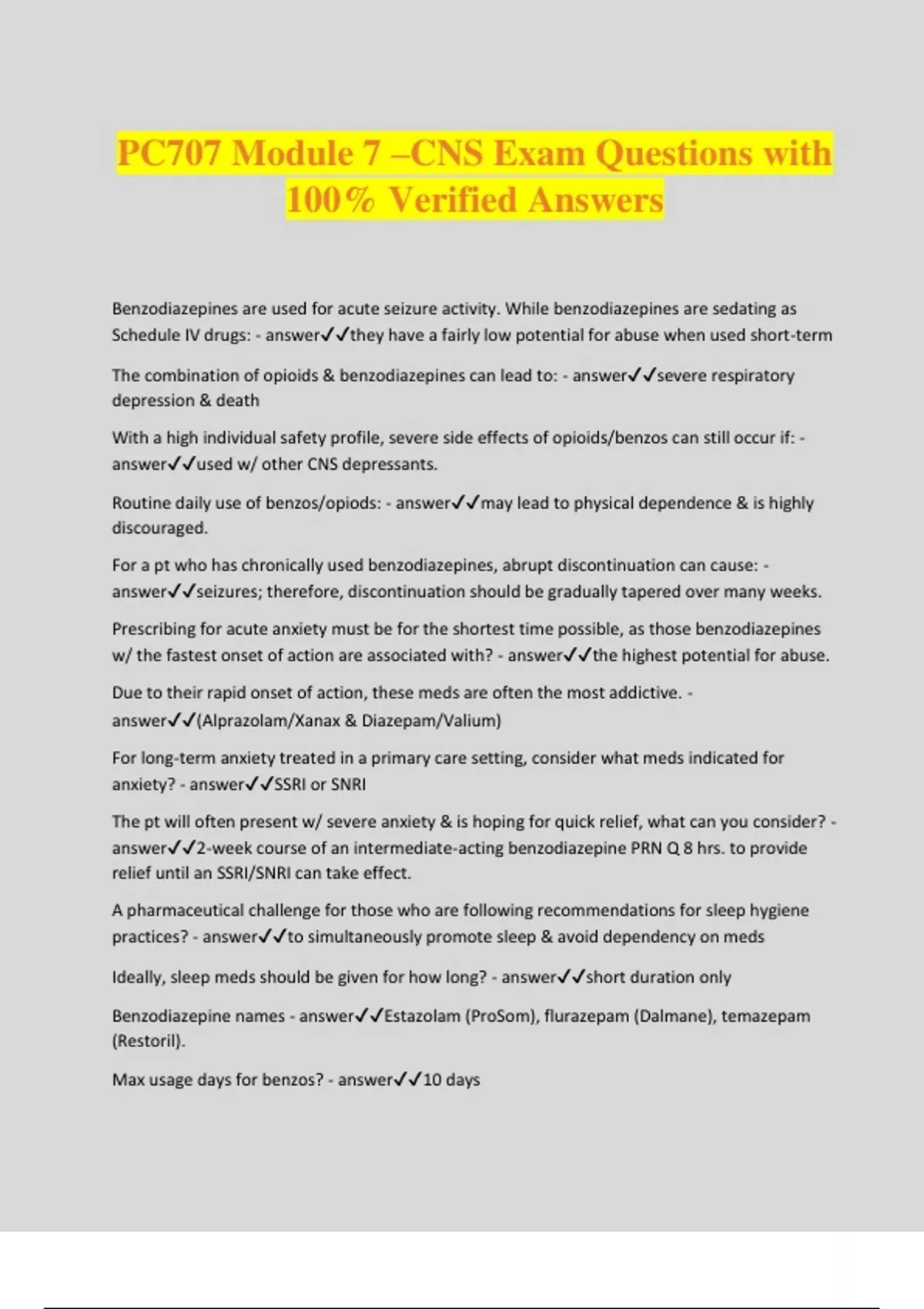 PC707 Module 7 –CNS Exam Questions with 100% Verified Answers Benzodiazepines are used for acute seizure activity. While benzodiazepines are sedating as Schedule IV drugs: - answerthey have a fairly low potential for abuse when used short-term The combination of opioids & benzodiazepines can lead to: - answersevere respiratory depression & death With a high individual safety profile, severe side effects of opioids/benzos can still occur if: - answerused w/ other CNS depressants. Routine daily use of benzos/opiods: - answermay lead to physical dependence & is highly discouraged. For a pt who has chronically used benzodiazepines, abrupt discontinuation can cause: - answerseizures; therefore, discontinuation should be gradually tapered over many weeks. Prescribing for acute anxiety must be for the shortest time possible, as those benzodiazepines w/ the fastest onset of action are associated with? - answerthe highest potential for abuse. Due to their rapid onset of action, these meds are often the most addictive. - answer(Alprazolam/Xanax & Diazepam/Valium) For long-term anxiety treated in a primary care setting, consider what meds indicated for anxiety? - answerSSRI or SNRI The pt will often present w/ severe anxiety & is hoping for quick relief, what can you consider? - answer2-week course of an intermediate-acting benzodiazepine PRN Q 8 hrs. to provide relief until an SSRI/SNRI can take effect. A pharmaceutical challenge for those who are following recommendations for sleep hygiene practices? - answerto simultaneously promote sleep & avoid dependency on meds Ideally, sleep meds should be given for how long? - answershort duration only Benzodiazepine names - answerEstazolam (ProSom), flurazepam (Dalmane), temazepam (Restoril). Max usage days for benzos? - answer10 days Rapid dose decreases of discontinuation can cause? - answerwithdrawal symptoms, including anxiety & insomnia Benzodiazepines & the benzodiazepine receptor agonists are not recommended in the elderly because? - answerRisk of cognitive impairment, falls, & fractures If a pt suffers from mild depression & has difficulty w/ sleeping, what is often given before bed due to its sedative effects? - answertrazodone Trazodone produces? Overdose is less of a risk w/ this drug than w/ TCAs. - answera moderate blockade of 5HT reuptake Improves conditions but doesn't cure them: - answerLifestyle changes Once a pt is in remission of depressions, the antidepressant tx should be continued for? - answersix to twelve months in order to promote complete recovery Evidence suggests that often complete remission is: - answernot achieved w/ the first antidepressant tx How long does it take to see an initial effect (after starting a SSRI) & to achieve a full effect? - answer2-3 weeks/up to 6 weeks If a pt complains they are not getting any better after a two-week trial of SSRI, it is important that they are told:. - answerthat it may take six weeks to achieve the maximum benefit from the med Only given in small amounts at a time due to the lethality and overdose risk: - answerTricyclic Antidepressants/TCAs Clients on MAOIs must follow a special diet that: - answerexcludes fermented or aged products Unique smoking cessation medication: - answerBupropion (Zyban) Bupropion benefits - answerthere is less sexual dysfunction reported & also may be associated w/ mild weight loss. Bupropion should not be given to anyone who has a history of: - answerseizure risk When choosing an antidepressant therapy: - answerpts w/ pain may achieve some pain relief w/ the use of duloxetine or a tricyclic The most studied antidepressant for use w/ children & is the only antidepressant recommended for use in children 8 yrs & above. - answerFluoxetine (Proza