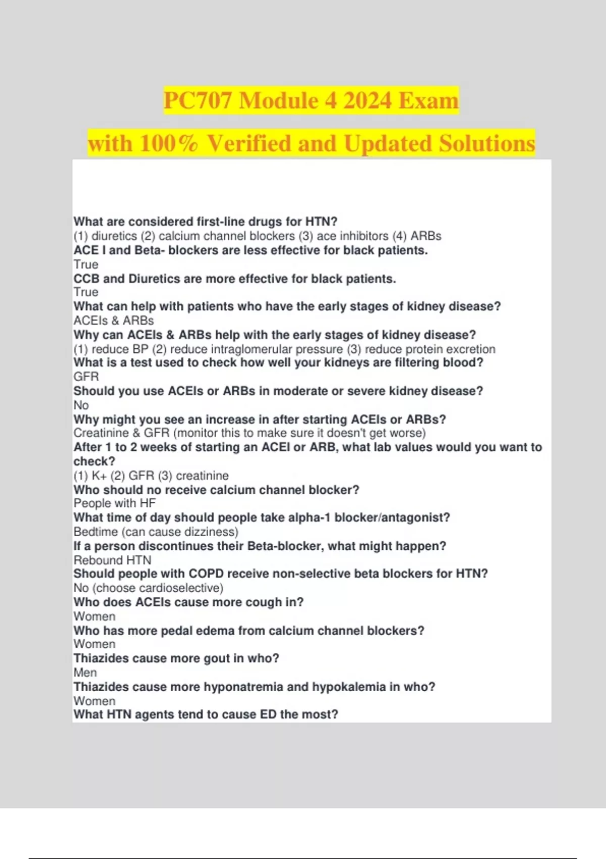 PC707 Module 4 2024 Exam with 100% Verified and Updated Solutions What are considered first-line drugs for HTN? (1) diuretics (2) calcium channel blockers (3) ace inhibitors (4) ARBs ACE I and Beta- blockers are less effective for black patients. True CCB and Diuretics are more effective for black patients. True What can help with patients who have the early stages of kidney disease? ACEIs & ARBs Why can ACEIs & ARBs help with the early stages of kidney disease? (1) reduce BP (2) reduce intraglomerular pressure (3) reduce protein excretion What is a test used to check how well your kidneys are filtering blood? GFR Should you use ACEIs or ARBs in moderate or severe kidney disease? No Why might you see an increase in after starting ACEIs or ARBs? Creatinine & GFR (monitor this to make sure it doesn't get worse) After 1 to 2 weeks of starting an ACEI or ARB, what lab values would you want to check? (1) K+ (2) GFR (3) creatinine Who should no receive calcium channel blocker? People with HF What time of day should people take alpha-1 blocker/antagonist? Bedtime (can cause dizziness) If a person discontinues their Beta-blocker, what might happen? Rebound HTN Should people with COPD receive non-selective beta blockers for HTN? No (choose cardioselective) Who does ACEIs cause more cough in? Women Who has more pedal edema from calcium channel blockers? Women Thiazides cause more gout in who? Men Thiazides cause more hyponatremia and hypokalemia in who? Women What HTN agents tend to cause ED the most? (1) thiazides (2) beta-blockers (3) spironolactone What CAM therapies should people with HTN not use? (1) devil's claw (2) ginseng (3) goldenseal (4) black licorice (5) ma huang (6) squill (7) Yohimbe What are some uses for beta-blockers? (1) BP (2) arrhythmias (3) HF (4) angina (5) MIs (6) migraines (7) tremors Where are B1 receptors? Heart Where are B2 receptors? Lungs What happens when you block B1 receptors? Decreased HR What happens when you block B2 receptors? Bronchoconstriction What are examples of cardio-selective beta blockers? (1) atenolol (2) metoprolol When should children be checked for HTN? Age 3 (start screening) When lifestyle changes have not helped children with HTN, what are the first-line drugs to use? (1) ACE (2) ARB (3) CCB (4) thiazide diuretic What should you consider when taking BP in elderly? Postural HTN How do you take postural BP in an elderly patient? Have the patient stand up What should you teach elderly patient to do when standing up if they are taking antihypertensives? Stand up slowly What happens to BP during the first trimester of pregnancy? Lower What happens to BP after first trimester of pregnancy? Returns to prepregnancy level Would medications be first response to HTN during pregnancy? No (can cause decreased placental perfusion) If a woman is taking ACEs or ARBs, what else would you consider starting them on if they are not currently pregnant? Contraception What htn medication can decrease breastmilk? Hydrochlorothiazide and calcium channel blockers What are the normal drugs used during pregnancy? (1) methyldopa (2) nifedipine (3) labetalol Who is at an increased risk for angioedema? Women and African americans What drug causes angioedema? ACEI, ARBs, DRI When does angioedema normally occur?
