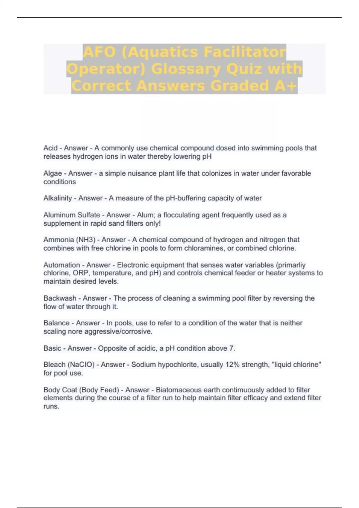 AFO (Aquatics Facilitator Operator) Glossary Quiz with Correct Answers Graded A+ Sample Question & Answer: Calcium Hypochlorite {Ca(CIO)2} - Answer - Compound of chlorine and calcium used in white granular or tablet form as a disinfectant in pools. Typically, 65% chlorine by weight and a pH of ~11 in water.