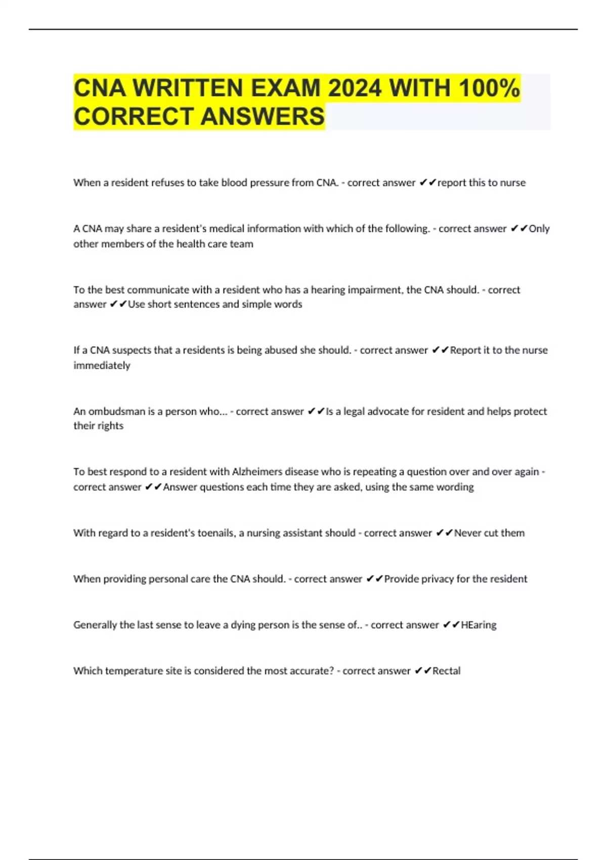 When a resident refuses to take blood pressure from CNA. - correct answer report this to nurse A CNA may share a resident's medical information with which of the following. - correct answer Only other members of the health care team To the best communicate with a resident who has a hearing impairment, the CNA should. - correct answer Use short sentences and simple words If a CNA suspects that a residents is being abused she should. - correct answer Report it to the nurse immediately An ombudsman is a person who... - correct answer Is a legal advocate for resident and helps protect their rights To best respond to a resident with Alzheimers disease who is repeating a question over and over again - correct answer Answer questions each time they are asked, using the same wording With regard to a resident's toenails, a nursing assistant should - correct answer Never cut them When providing personal care the CNA should. - correct answer Provide privacy for the resident