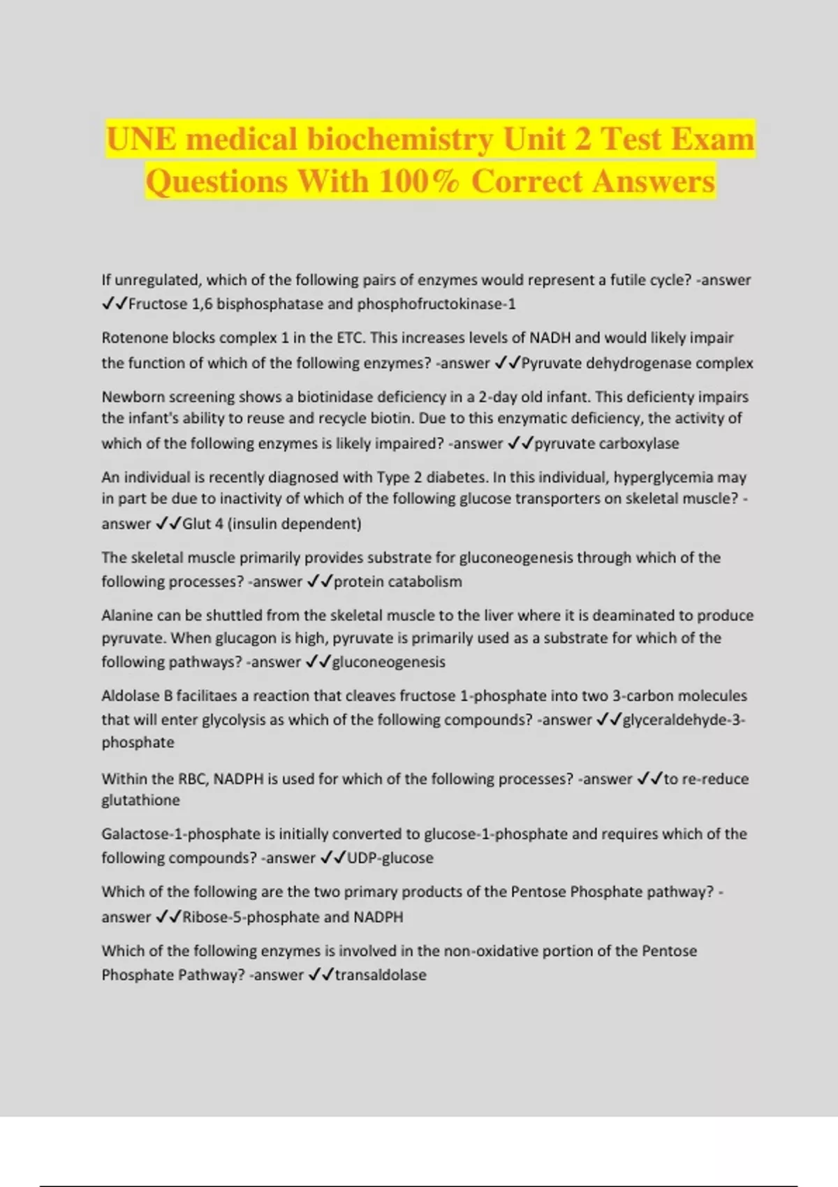 UNE medical biochemistry Unit 2 Test Exam Questions With 100% Correct Answers