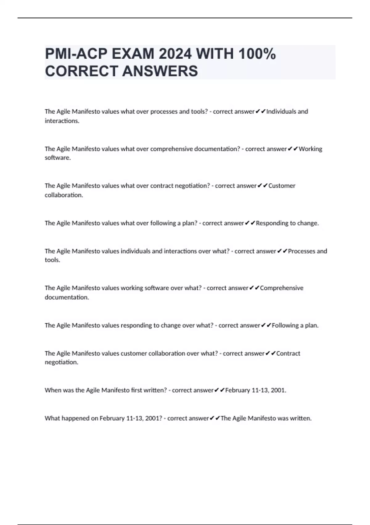 The Agile Manifesto values what over processes and tools? - correct answerIndividuals and interactions. The Agile Manifesto values what over comprehensive documentation? - correct answerWorking software. The Agile Manifesto values what over contract negotiation? - correct answerCustomer collaboration. The Agile Manifesto values what over following a plan? - correct answerResponding to change. The Agile Manifesto values individuals and interactions over what? - correct answerProcesses and tools. The Agile Manifesto values working software over what? - correct answerComprehensive documentation. The Agile Manifesto values responding to change over what? - correct answerFollowing a plan. The Agile Manifesto values customer collaboration over what? - correct answerContract negotiation. When was the Agile Manifesto first written? - correct answerFebruary 11-13, 2001. What