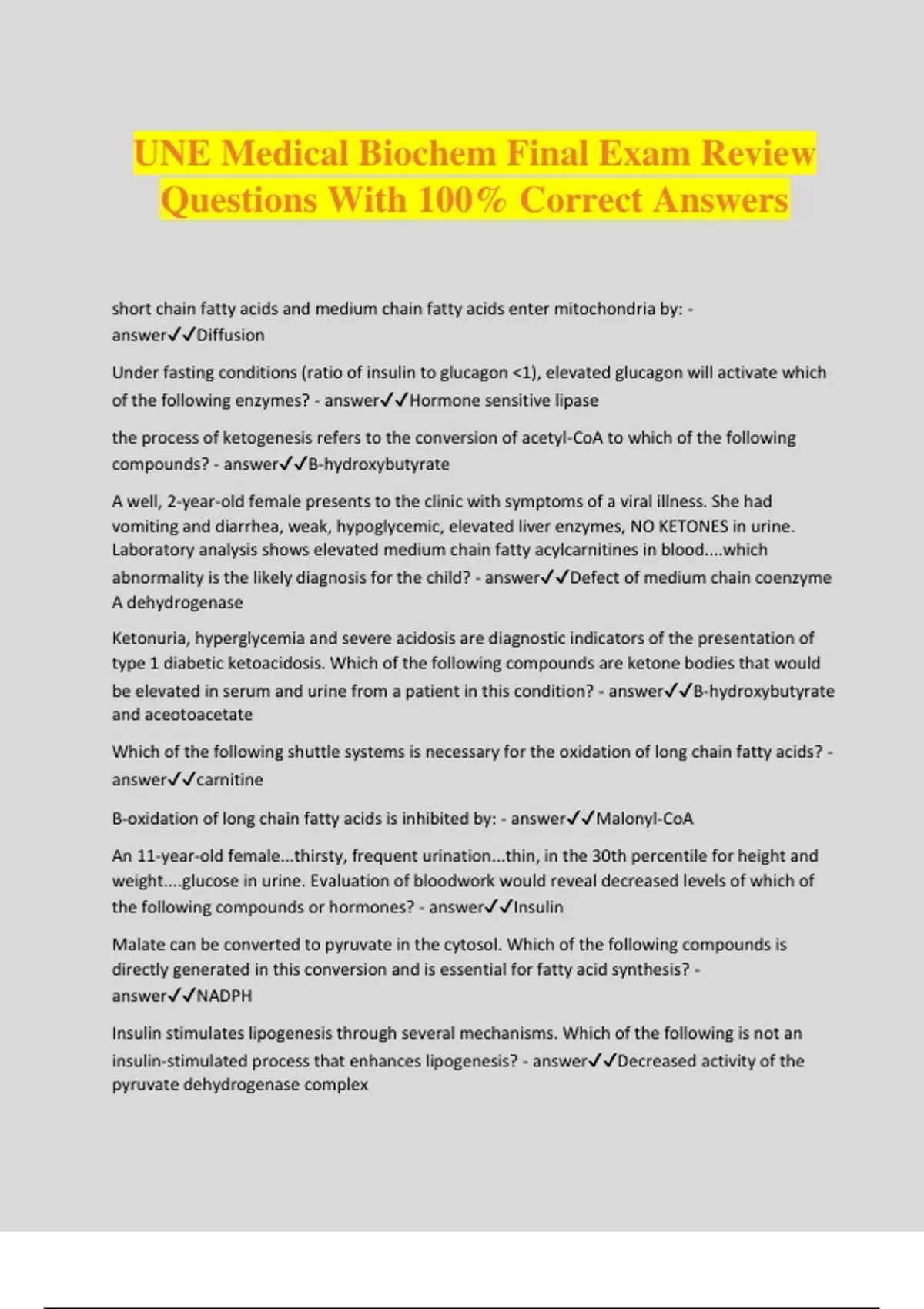 UNE Medical Biochem Final Exam Review Questions With 100% Correct Answers