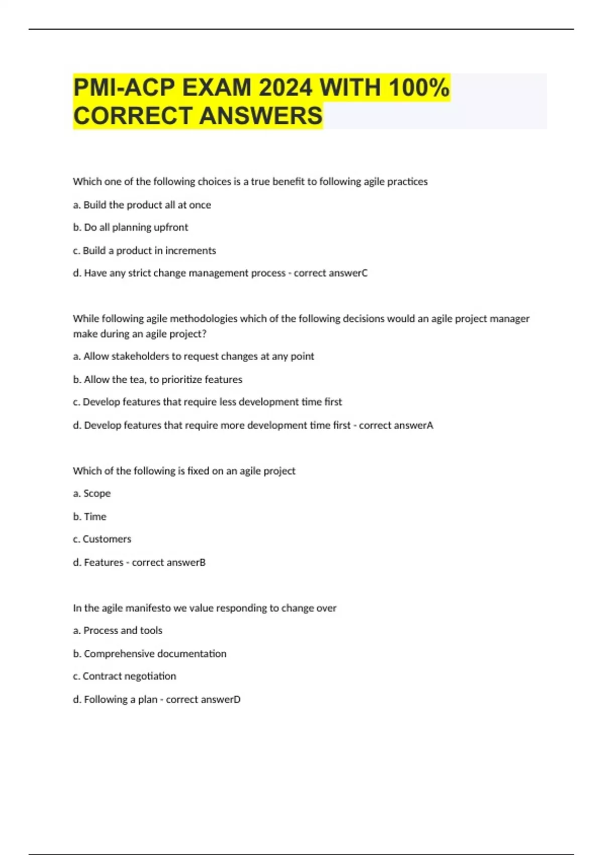 Which one of the following choices is a true benefit to following agile practices a. Build the product all at once b. Do all planning upfront c. Build a product in increments d. Have any strict change management process - correct answerC While following agile methodologies which of the following decisions would an agile project manager make during an agile project? a. Allow stakeholders to request changes at any point b. Allow the tea, to prioritize features c. Develop features that require less development time first d. Develop features that require more development time first - correct answerA Which of the following is fixed on an agile project a. Scope b. Time c. Customers d. Features - correct answerB In the agile manifesto we value responding to change over a. Process and tools b. Comprehensive documentation c. Contract negotiation d. Following a plan - correct answerD