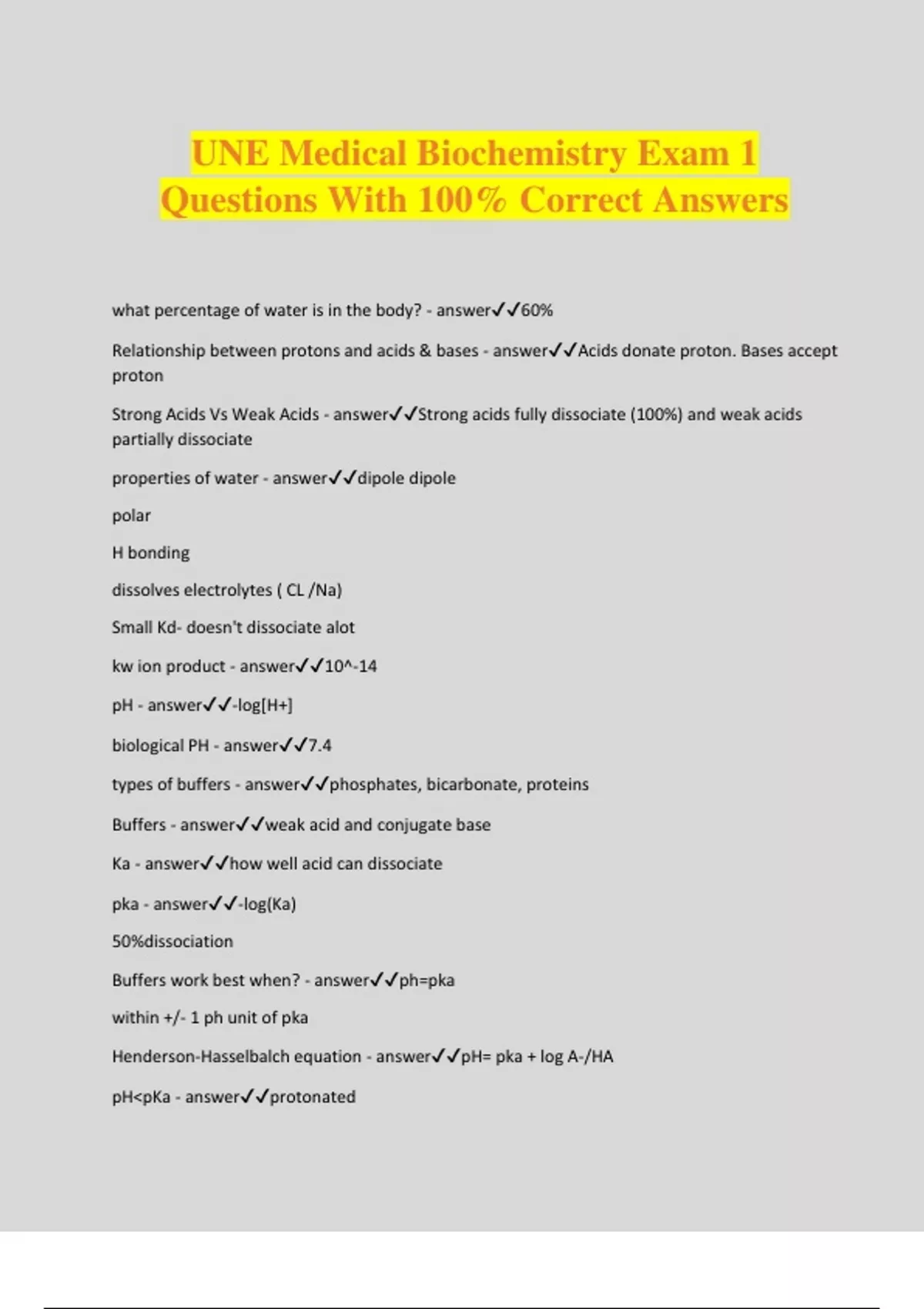 UNE Medical Biochemistry Exam 1 Questions With 100% Correct Answers