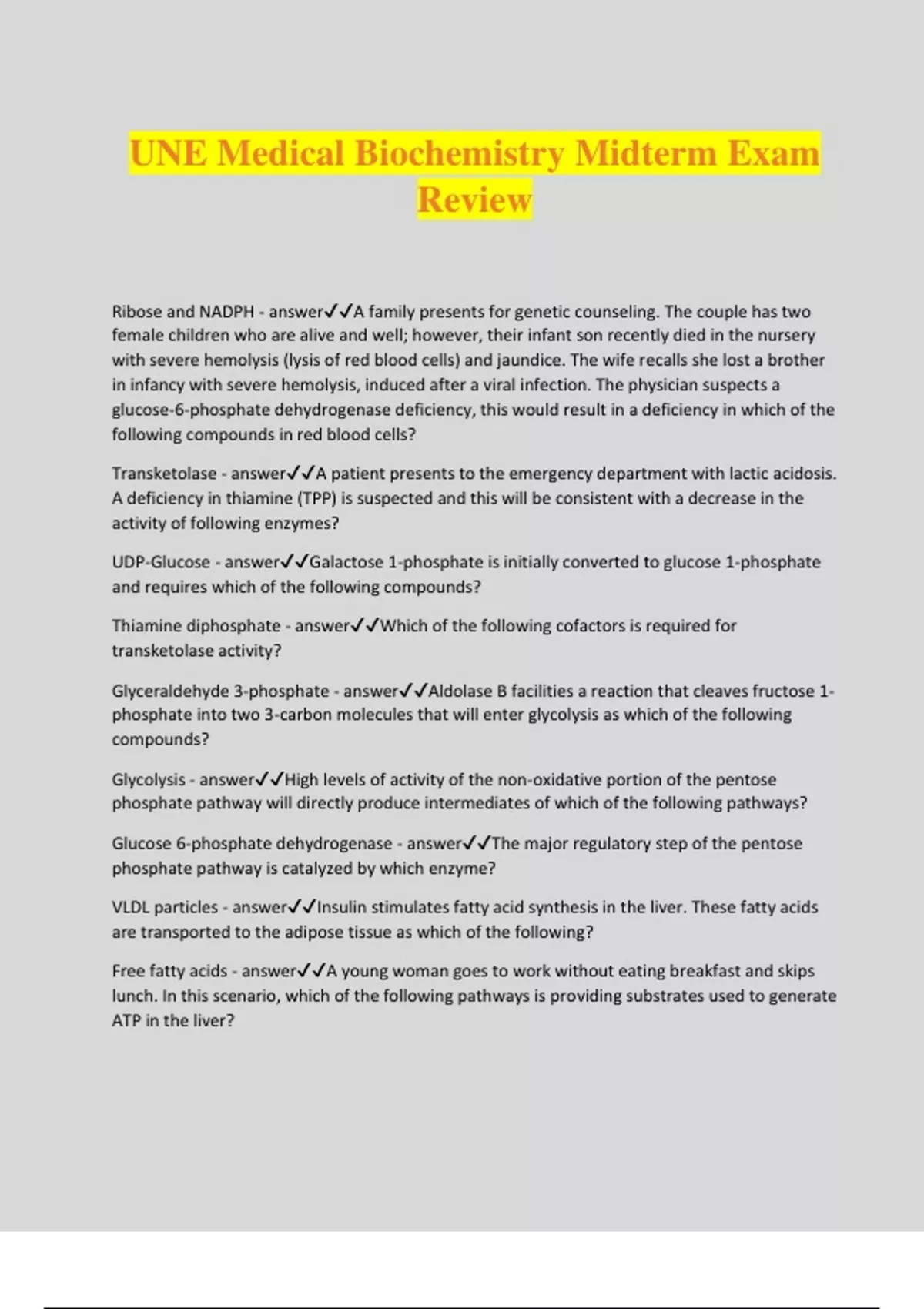 UNE Medical Biochemistry Midterm Exam Review Ribose and NADPH - answerA family presents for genetic counseling. The couple has two female children who are alive and well; however, their infant son recently died in the nursery with severe hemolysis (lysis of red blood cells) and jaundice. The wife recalls she lost a brother in infancy with severe hemolysis, induced after a viral infection. The physician suspects a glucose-6-phosphate dehydrogenase deficiency, this would result in a deficiency in which of the following compounds in red blood cells? Transketolase - answerA patient presents to the emergency department with lactic acidosis. A deficiency in thiamine (TPP) is suspected and this will be consistent with a decrease in the activity of following enzymes? UDP-Glucose - answerGalactose 1-phosphate is initially converted to glucose 1-phosphate and requires which of the following compounds? Thiamine diphosphate - answerWhich of the following cofactors is required for transketolase activity? Glyceraldehyde 3-phosphate - answerAldolase B facilities a reaction that cleaves fructose 1- phosphate into two 3-carbon molecules that will enter glycolysis as which of the following compounds? Glycolysis - answerHigh levels of activity of the non-oxidative portion of the pentose phosphate pathway will directly produce intermediates of which of the following pathways? Glucose 6-phosphate dehydrogenase - answerThe major regulatory step of the pentose phosphate pathway is catalyzed by which enzyme? VLDL particles - answerInsulin stimulates fatty acid synthesis in the liver. These fatty acids are transported to the adipose tissue as which of the following? Free fatty acids - answerA young woman goes to work without eating breakfast and skips lunch. In this scenario, which of the following pathways is providing substrates used to generate ATP in the liver? Glucagon - answerCaffeine is a natural inhibitor of phosphodiesterase. If you were to consume a large amount of coffee you would likely see a prolonged response to which of the following stimulants or hormones? They enhance transcription when bound to receptors - answerA teenage female presenting with lack of menstruation (amenorrhea) is found to have a dysfunctional steroid receptor characteristic of androgen insensitivity syndrome. Which of the following statements accurately describes steroid hormones? Intracellular receptors - answerSteroid hormones bind which of the following types of receptors? They are specific to a chemical messenger - answerWhich of the following is a characteristic of all receptors? Free fatty acids - answerWhat is the primary oxidized fuel for skeletal muscle in the fasted state? Cyclic-AMP response element binding protein (CREB) - answercAMP elicits multiple cellular responses. The effects of cAMP on gene transcription are directly mediated by which of the following DNA binding proteins? GLUT4 - answerAn individual is recently diagnosed with Type 2 diabetes. In this individual, hyperglycemia may in part be due to inactivity of which of the following glucose transporters on skeletal muscle? Adenylyl cyclase - answerGlycogen degradation in the liver can be enhanced by elevated glucagon and the activation of a Gαs receptor. The initial step in this cascade involves which of the following second messengers or active enzymes? 2 - answerWhich of the following combinations of compounds is required to fully activate pyruvate carboxylase (+ indicates compo