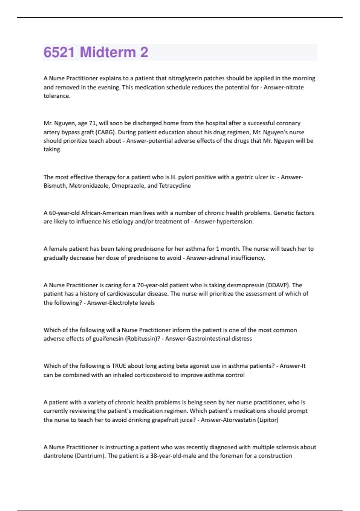 A Nurse Practitioner explains to a patient that nitroglycerin patches should be applied in the morning and removed in the evening. This medication schedule reduces the potential for - Answer-nitrate tolerance. Mr. Nguyen, age 71, will soon be discharged home from the hospital after a successful coronary artery bypass graft (CABG). During patient education about his drug regimen, Mr. Nguyen's nurse should prioritize teach about - Answer-potential adverse effects of the drugs that Mr. Nguyen will be taking. The most effective therapy for a patient who is H. pylori positive with a gastric ulcer is: - AnswerBismuth, Metronidazole, Omeprazole, and Tetracycline A 60-year-old African-American man lives with a number of chronic health problems. Genetic factors are likely to influence his etiology and/or treatment of - Answer-hypertension. A female patient has been taking prednisone for her asthma for 1 month. The nurse will teach her to gradually decrease her dose of prednisone to avoid - Answer-adrenal insufficiency. A Nurse Practitioner is caring for a 70-year-old patient who is taking desmopressin (DDAVP). The patient has a history of cardiovascular disease. The nurse will prioritize the assessment of which of the following? - Answer-Electrolyte levels Which of the following will a Nurse Practitioner inform the patient is one of the most common adverse effects of guaifenesin (Robitussin)? - Answer-Gastrointestinal distress Which of the following is TRUE about long acting beta agonist use in asthma patients? - Answer-It can be combined with an inhaled corticosteroid to improve asthma control A patient with a variety of chronic health problems is being seen by her nurse practitioner, who is currently reviewing the patient's medication regimen. Which patient's medications should prompt the nurse to teach her to avoid drinking grapefruit juice? - Answer-Atorvastatin (Lipitor) A Nurse Practitioner is instructing a patient who was recently diagnosed with multiple sclerosis about dantrolene (Dantrium). The patient is a 38-year-old-male and the foreman for a constructioncompany. In order to minimize one important adverse effect of the drug, the nurse will give the patient which of the following instructions? - Answer-Wear appropriate clothing and sunscreen whenever he is in direct sunlight A 66-year-old type 1 diabetes, woman has a complex renal failure as a poorly-controlled failure (CHF). Her care provider woman's medication regimen. The nurse should medical history that includes result of diabetic nephropathy and chronic heart has recently added spironolactone (Aldactone) to the consequently assess for signs and symptoms of - Answer-hyperkalemia. A Nurse Practitioner is providing discharge planning for a 45-year-old woman who has a prescription for oral albuterol. The Nurse Practitioner will question the patient about her intake of which of the following? - Answer-Coffee
