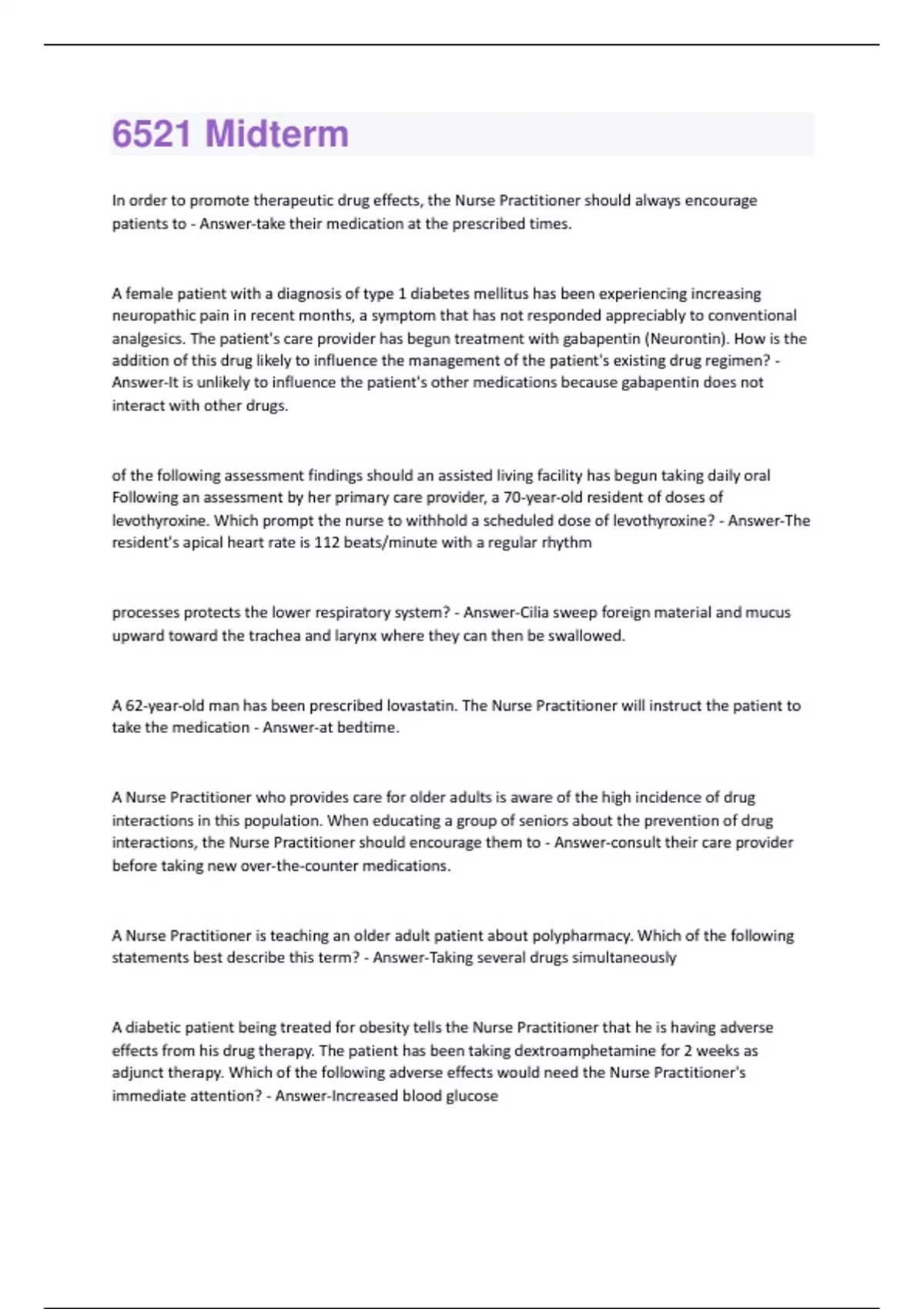 In order to promote therapeutic drug effects, the Nurse Practitioner should always encourage patients to - Answer-take their medication at the prescribed times. A female patient with a diagnosis of type 1 diabetes mellitus has been experiencing increasing neuropathic pain in recent months, a symptom that has not responded appreciably to conventional analgesics. The patient's care provider has begun treatment with gabapentin (Neurontin). How is the addition of this drug likely to influence the management of the patient's existing drug regimen? - Answer-It is unlikely to influence the patient's other medications because gabapentin does not interact with other drugs. of the following assessment findings should an assisted living facility has begun taking daily oral Following an assessment by her primary care provider, a 70-year-old resident of doses of levothyroxine. Which prompt the nurse to withhold a scheduled dose of levothyroxine? - Answer-The resident's apical heart rate is 112 beats/minute with a regular rhythm processes protects the lower respiratory system? - Answer-Cilia sweep foreign material and mucus upward toward the trachea and larynx where they can then be swallowed. A 62-year-old man has been prescribed lovastatin. The Nurse Practitioner will instruct the patient to take the medication - Answer-at bedtime. A Nurse Practitioner who provides care for older adults is aware of the high incidence of drug interactions in this population. When educating a group of seniors about the prevention of drug interactions, the Nurse Practitioner should encourage them to - Answer-consult their care provider before taking new over-the-counter medications. A Nurse Practitioner is teaching an older adult patient about polypharmacy. Which of the following statements best describe this term? - Answer-Taking several drugs simultaneously A diabetic patient being treated for obesity tells the Nurse Practitioner that he is having adverse effects from his drug therapy. The patient has been taking dextroamphetamine for 2 weeks as adjunct therapy. Which of the following adverse effects would need the Nurse Practitioner's immediate attention? - Answer-Increased blood glucoseA 22 year old patient is transitioning from oral agents to insulin. He will be taking 20 units of lantus at bedtime and regular insulin before meals. What instructions should the NP provide about the timing and dose of regular insulin? - Answer-Take 1 unit of regular insulin for each 10 grams of carbohydrate to be consumed 15 minutes before each meal decongestants should not be used chronically (>5 days) because they can cause - Answer-rebound rhinitis/congestion The parents of a 7-year-old boy who has just been diagnosed with allergic asthma are being taught about their son's medication regimen by the nurse. The nurse is currently teaching the parent's about the appropriate use of a "rescue drug" for acute exacerbations of their son's asthma. What drug should the nurse suggests the parents to use in these situations? - Answer-Albuterol A 70-year-old woman with a history of atrial fibrillation takes digoxin and verapamil to control her health problem. Verapamil achieves a therapeutic effect by - Answer-blocking adrenergic receptors and producing antisympathetic effects. A patient receives 25 units of NPH insulin at 7.AM. At what time of day should the nurse advise the patient to be most alert for a potential hypoglycemic reaction? - Answer-Late afternoon