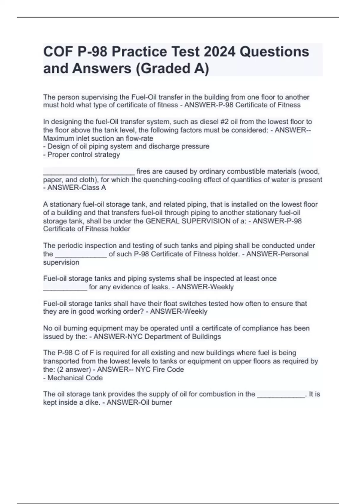 COF P-98 Practice Test 2024 Questions and Answers (Graded A)COF P-98 Practice Test 2024 Questions and Answers (Graded A)COF P-98 Practice Test 2024 Questions and Answers (Graded A)COF P-98 Practice Test 2024 Questions and Answers (Graded A) The person supervising the Fuel-Oil transfer in the building from one floor to another must hold what type of certificate of fitness - ANSWER-P-98 Certificate of Fitness In designing the fuel-Oil transfer system, such as diesel #2 oil from the lowest floor to the floor above the tank level, the following factors must be considered: - ANSWER-- Maximum inlet suction an flow-rate - Design of oil piping system and discharge pressure - Proper control strategy _______________________ fires are caused by ordinary combustible materials (wood, paper, and cloth), for which the quenching-cooling effect of quantities of water is present - ANSWER-Class A