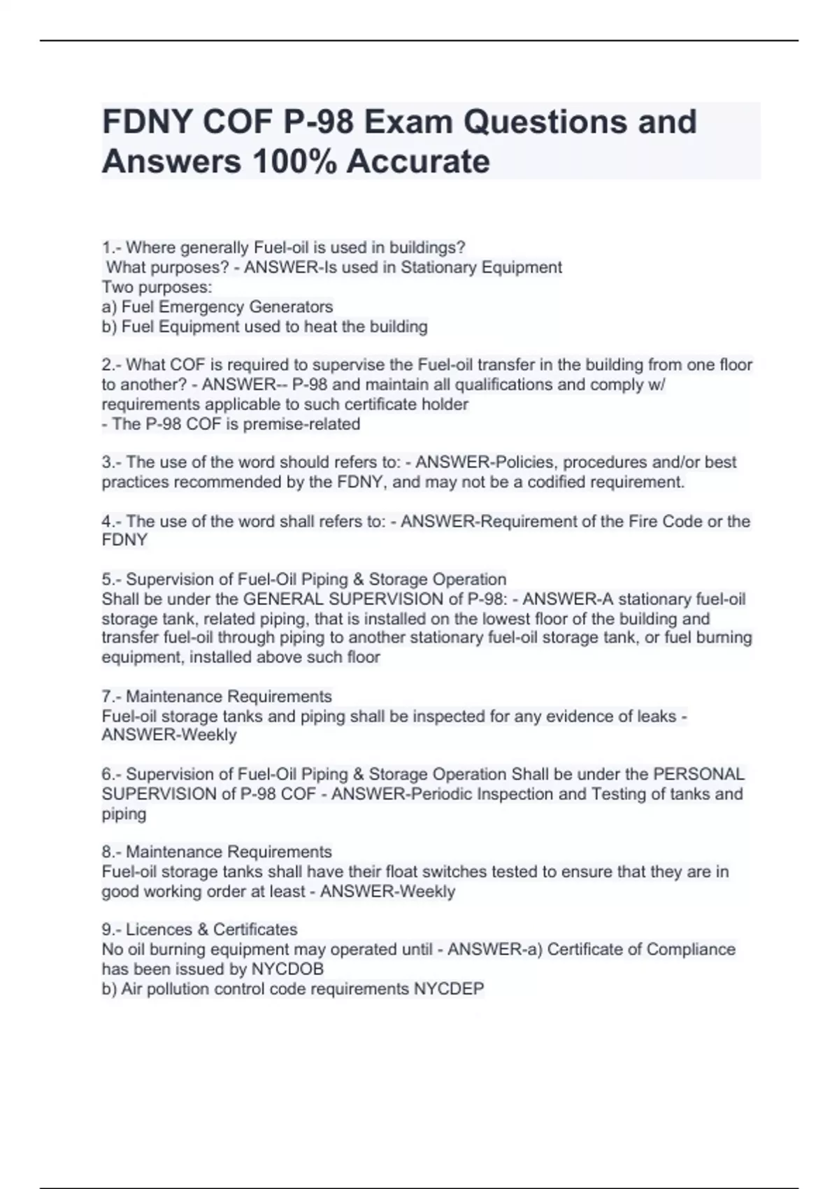FDNY COF P-98 Exam Questions and Answers 100% AccurateFDNY COF P-98 Exam Questions and Answers 100% AccurateFDNY COF P-98 Exam Questions and Answers 100% AccurateFDNY COF P-98 Exam Questions and Answers 100% Accurate 1.- Where generally Fuel-oil is used in buildings? What purposes? - ANSWER-Is used in Stationary Equipment Two purposes: a) Fuel Emergency Generators b) Fuel Equipment used to heat the building 2.- What COF is required to supervise the Fuel-oil transfer in the building from one floor to another? - ANSWER-- P-98 and maintain all qualifications and comply w/ requirements applicable to such certificate holder - The P-98 COF is premise-related 3.- The use of the word should refers to: - ANSWER-Policies, procedures and/or best practices recommended by the FDNY, and may not be a codified requirement. 4.- The use of the word shall refers to: - ANSWER-Requirement of the Fire Code or the FDNY 5.- Supervision of Fuel-Oil Piping & Storage Operation