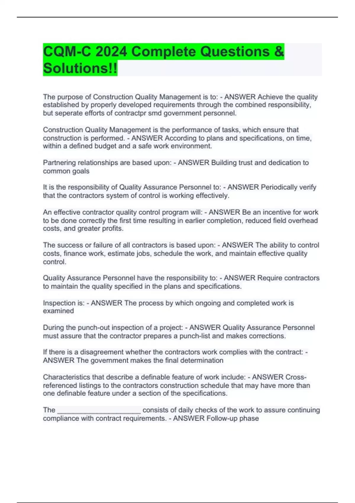 The purpose of Construction Quality Management is to: - ANSWER Achieve the quality established by properly developed requirements through the combined responsibility, but seperate efforts of contractpr smd government personnel. Construction Quality Management is the performance of tasks, which ensure that construction is performed. - ANSWER According to plans and specifications, on time, within a defined budget and a safe work environment. Partnering relationships are based upon: - ANSWER Building trust and dedication to common goals It is the responsibility of Quality Assurance Personnel to: - ANSWER Periodically verify that the contractors system of control is working effectively. An effective contractor quality control program will: - ANSWER Be an incentive for work to be done correctly the first time resulting in earlier completion, reduced field overhead costs, and greater profits. The success or failure of all contractors is based upon: - ANSWER The ability to control costs, finance work, estimate jobs, schedule the work, and maintain effective quality control.