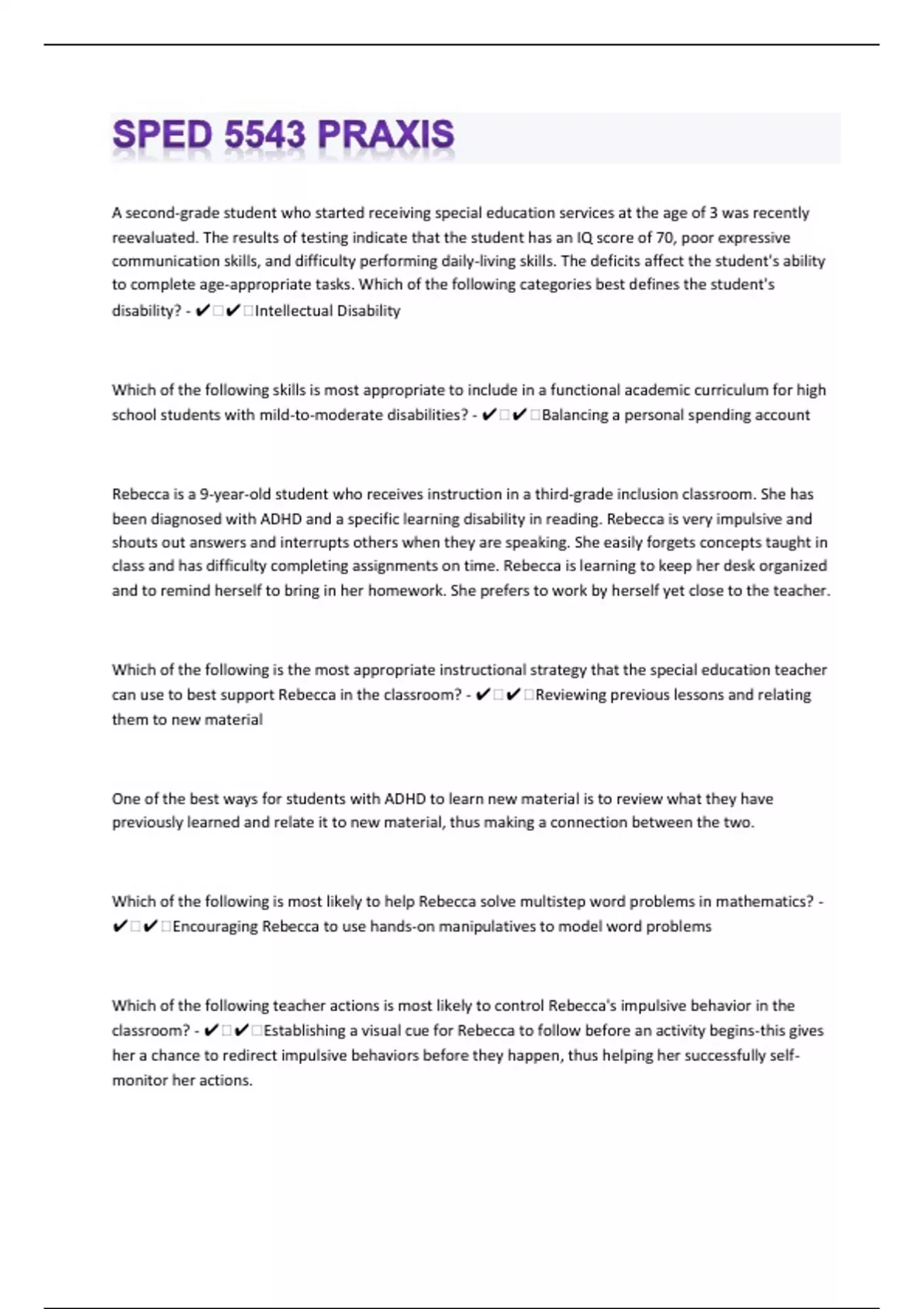 A second-grade student who started receiving special education services at the age of 3 was recently reevaluated. The results of testing indicate that the student has an IQ score of 70, poor expressive communication skills, and difficulty performing daily-living skills. The deficits affect the student's ability to complete age-appropriate tasks. Which of the following categories best defines the student's disability? - ️️Intellectual Disability Which of the following skills is most appropriate to include in a functional academic curriculum for high school students with mild-to-moderate disabilities? - ️️Balancing a personal spending account Rebecca is a 9-year-old student who receives instruction in a third-grade inclusion classroom. She has been diagnosed with ADHD and a specific learning disability in reading. Rebecca is very impulsive and shouts out answers and interrupts others when they are speaking. She easily forgets concepts taught in class and has difficulty completing assignments on time. Rebecca is learning to keep her desk organized and to remind herself to bring in her homework. She prefers to work by herself yet close to the teacher. Which of the following is the most appropriate instructional strategy that the special education teacher can use to best support Rebecca in the classroom? - ️️Reviewing previous lessons and relating them to new material One of the best ways for students with ADHD to learn new material is to review what they have previously learned and relate it to new material, thus making a connection between the two. Which of the following is most likely to help Rebecca solve multistep word problems in mathematics? - ️️Encouraging Rebecca to use hands-on manipulatives to model word problems Which of the following teacher actions is most likely to control Rebecca's impulsive behavior in the classroom? - ️️Establishing a visual cue for Rebecca to follow before an activity begins-this gives her a chance to redirect impulsive behaviors before they happen, thus helping her successfully self-monitor her actions.