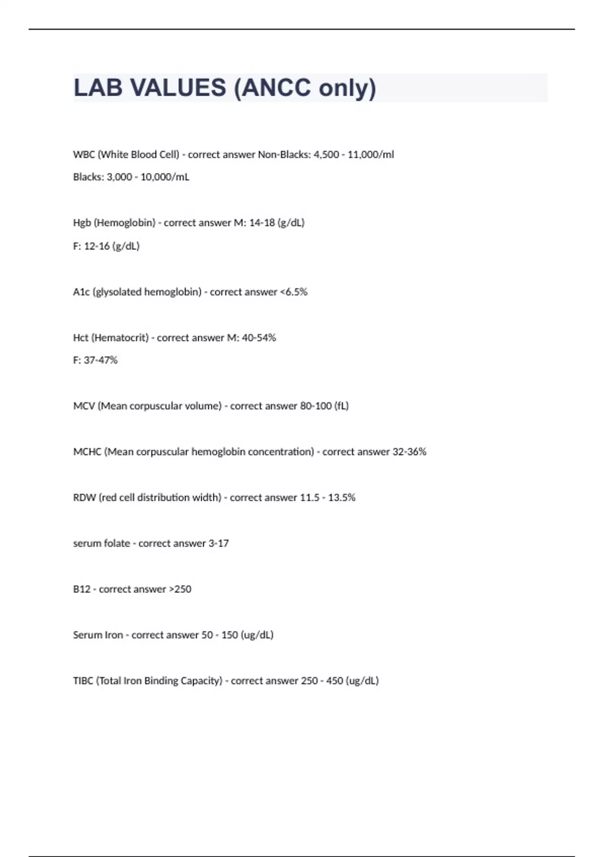 LAB VALUES (ANCC only) Questions with complete solution 2024WBC (White Blood Cell) - correct answer Non-Blacks: 4,500 - 11,000/ml Blacks: 3,000 - 10,000/mL Hgb (Hemoglobin) - correct answer M: 14-18 (g/dL) F: 12-16 (g/dL) A1c (glysolated hemoglobin) - correct answer <6.5% Hct (Hematocrit) - correct answer M: 40-54% F: 37-47% MCV (Mean corpuscular volume) - correct answer 80-100 (fL) MCHC (Mean corpuscular hemoglobin concentration) - correct answer 32-36%