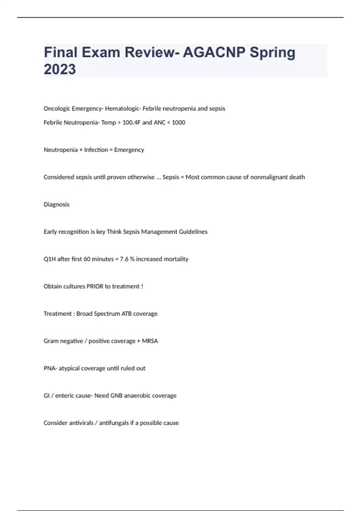Final Exam Review- AGACNP Spring 2023/2024 Question and answers correctly solved Oncologic Emergency- Hematologic- Febrile neutropenia and sepsis Febrile Neutropenia- Temp > 100.4F and ANC < 1000 Neutropenia + Infection = Emergency Considered sepsis until proven otherwise ... Sepsis = Most common cause of nonmalignant death Diagnosis Early recognition is key Think Sepsis Management Guidelines Q1H after first 60 minutes = 7.6 % increased mortality Obtain cultures PRIOR to treatment ! Treatment : Broad Spectrum ATB coverage Gram negative / positive coverage + MRSA PNA- atypical coverage until ruled out GI / enteric cause- Need GNB anaerobic coverage Consider antivirals / antifu