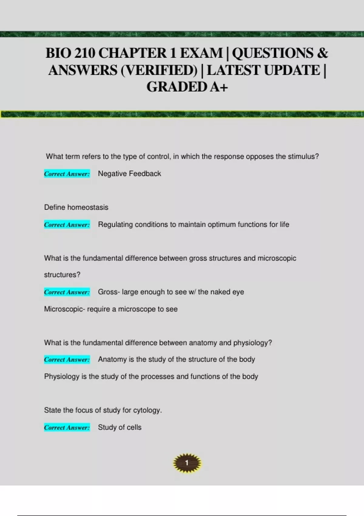 BIO 210 CHAPTER 1 EXAM | QUESTIONS & ANSWERS (VERIFIED) | LATEST UPDATE | GRADED A+