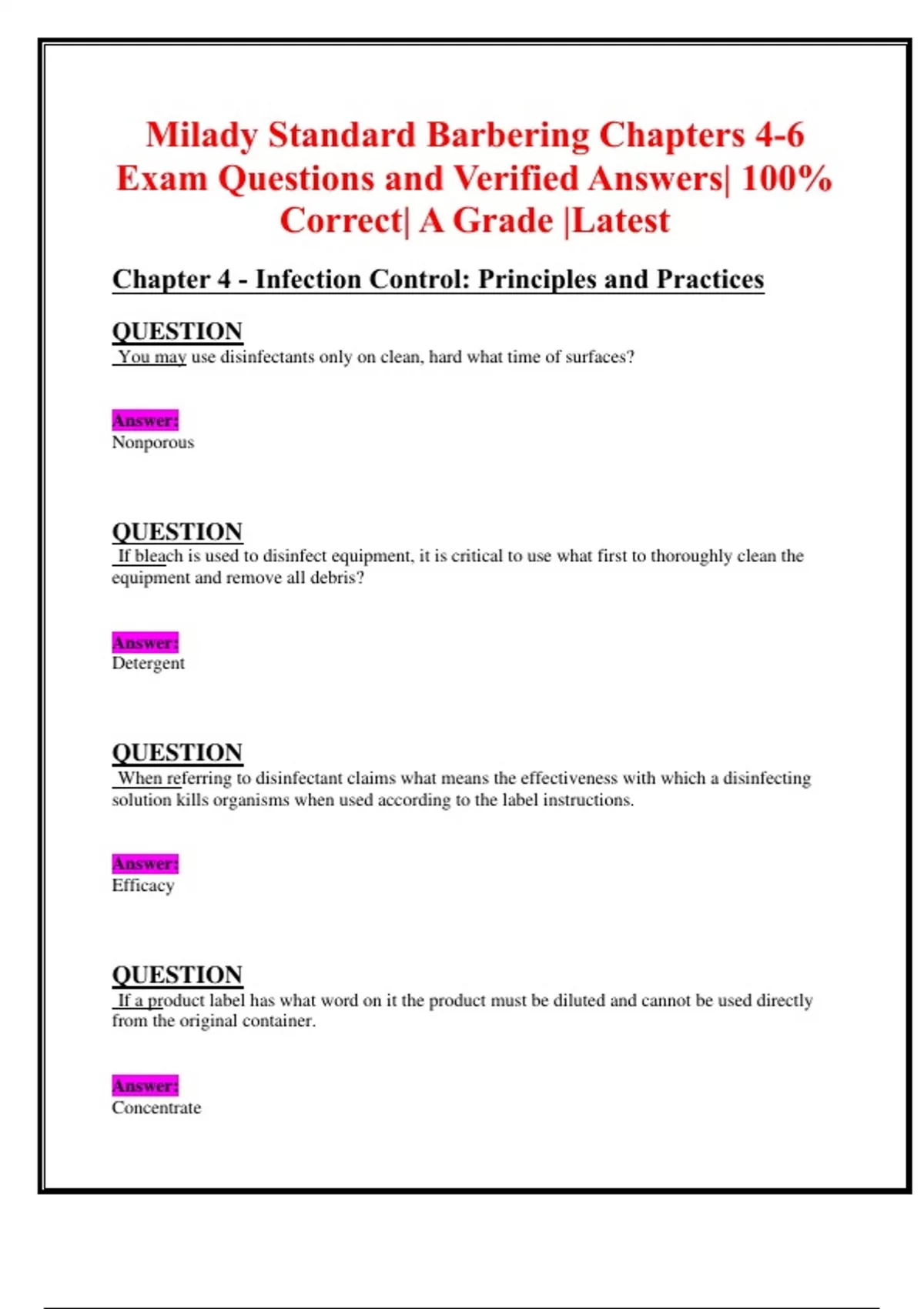 Milady Standard Barbering Chapters 4-6 Exam Questions and Verified Answers| 100% Correct| A Grade |Latest Chapter 4 - Infection Control: Principles and Practices QUESTION You may use disinfectants only on clean, hard what time of surfaces? Answer: Nonporous QUESTION If bleach is used to disinfect equipment, it is critical to use what first to thoroughly clean the equipment and remove all debris? Answer: Detergent QUESTION When referring to disinfectant claims what means the effectiveness with which a disinfecting solution kills organisms when used according to the label instructions. Answer: Efficacy QUESTION If a product label has what word on it the product must be diluted and cannot be used directly from the original container. Answer: Concentrate QUESTION What is acceptable to use disinfectants on? Answer: Tools QUESTION When there is a reaction due to extreme sensitivity to certain foods, chemicals or other normally harmless substance. Answer: Allergy QUESTION What is another name for 5.25 percent sodium hypochlorite? Answer: Bleach QUESTION Federal and state agencies regulate the practice of barbering. State agencies regulate what? Answer: Regulate licensing QUESTION What standards address issues relating to your right to know about any potentially hazardous ingredients contained in the products and how to avoid these hazards? Answer: OSHA QUESTION What type of bacteria rarely demonstrate self-movement and are transmitted in the air, dust, or within the substance in which they settle? Answer: Cocci QUESTION Which type of bacteria is spherical, grows in pairs and cause diseases such as pneumonia? Answer: Diplococci QUESTION What type of bacteria are pus-forming and grow in clusters like bunches of grapes? Answer: Staphylococci QUESTION That type of bacteria are harmful microorganisms that can cause disease or infection in humans when they invade the body? Answer: Pathogenic QUESTION What are tuberculocidal disinfectant often referred as?