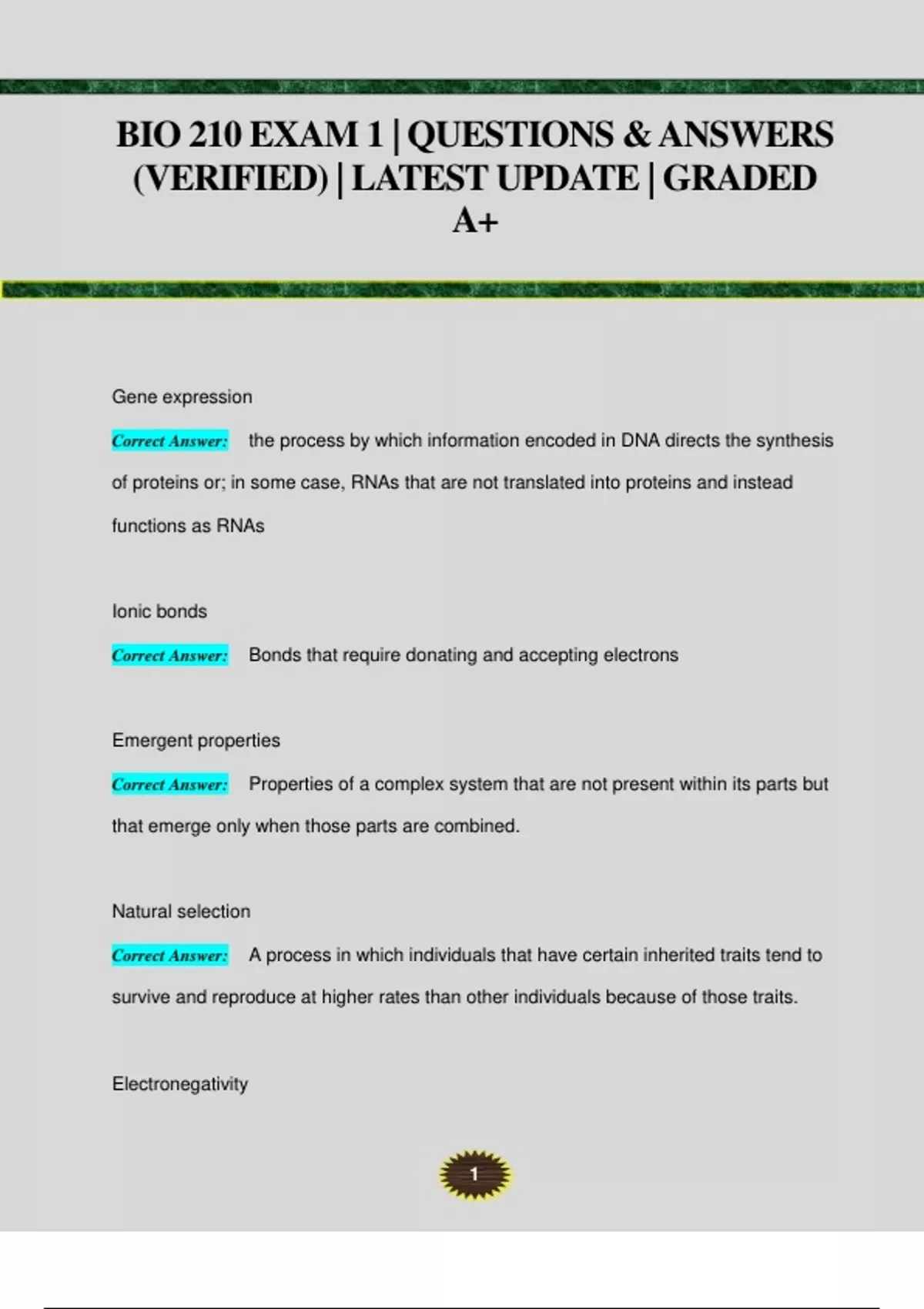 1 BIO 210 EXAM 1 | QUESTIONS & ANSWERS (VERIFIED) | LATEST UPDATE | GRADED A+ Gene expression Correct Answer: the process by which information encoded in DNA directs the synthesis of proteins or; in some case, RNAs that are not translated into proteins and instead functions as RNAs Ionic bonds Correct Answer: Bonds that require donating and accepting electrons Emergent properties Correct Answer: Properties of a complex system that are not present within its parts but that emerge only when those parts are combined. Natural selection Correct Answer: A process in which individuals that have certain inherited traits tend to survive and reproduce at higher rates than other individuals because of those traits. Electronegativity 2 Correct Answer: is a measure of the tendency of an atom to attract a bonding pair of electrons. Polar covalent bond Correct Answer: a covalent bond between atoms that differ in electronegativity. The shared electrons are pulled closer to the more electronegative atom, making it slightly negative and the other atom slightly positive Anion Correct Answer: A negatively charged ion Cation Correct Answer: A positively charged ion Van der Waals interactions Correct Answer: very weak interaction between molecules due to temporary charges attracting atoms that are very close together hydrogen bonds Correct Answer: A type of weak chemical bond formed when the slightly positive hydrogen atom of a polar covalent bond in one molecule is attracted to the slightly negative atom of a polar covalent bond in another molecule. 3 Adhesion Correct Answer: An attraction between molecules of different substances Cohesion Correct Answer: Attraction between molecules of the same substance Specific heat Correct Answer: The measure of the heat energy required to increase the temperature of a unit quantity of a substance by a certain temperature interval.The amount of energy required to raise the temperature of 1 gram of a substance by 1 degree Celsius Evaporative cooling Correct Answer: The process in which the surface of an object becomes cooler during evaporation, a result of the molecules with the greatest kinetic energy changing from the liquid to the gaseous state Heat of vaporization Correct Answer: The amount of energy required for the liquid at its boiling point to become a gas Hydrocarbons Correct Answer: organic molecules consisting of only carbon and hydrogen 4 cis/trans isomers Correct Answer: Trans- they are on opposite sides Cis- they are on the same side Enantiomers Correct Answer: Isomers that are mirror images of each other adenosine triphosphate Correct Answer: -an energy containing compound made of nitrogen component adenine, 5-carbon sugar called ribose, and three phosphate group polymer Correct Answer: a long molecule consisting of many similar or identical monomers linked together by covalent bonds monomers Correct Answer: A chemical subunit that serves as a building block of a polymer. Dehydration reactions Correct Answer: chemical reactions that involve the loss of water from the reacting molecule hydrolysis 5 Correct Answer: Breaking down complex molecules by the chemical addition of water carbohydrates Correct Answer: simple sugars that can be broken down to release energy monosaccharides Correct Answer: simple sugars starch Correct Answer: A storage polysaccharide found in the roots of plants and certain other cells; a polymer of glucose. glycosidic linkage Correct Answer: a covalent bond formed between two monosaccharaides by a dehydration reaction. polysaccharides Correct Answer: a polymer of many monosaccharides, formed by dehydration reactions glycogen Correct Answer: A form of stored blood sugar (glucose) typically derived from food; stored in limited amounts in skeletal muscle, liver, and brain. 6 cellulose Correct Answer: A structural polysaccharide of cell walls, consisting of glucose monomers joined by b-1, 4-glycosidic linkages. Humans can not digest, cows can lipids Correct Answer: A group of organic compounds composed mostly of carbon and hydrogen including a proportionately smaller amount of oxygen; are insoluble in water, serve as a source of stored energy, and are a component of cell membranes. disaccaride Correct Answer: two monosaccarides linked together by dehydration synthesis; glycosidic linkage saturated fatty acids Correct Answer: A fatty acid in which all carbons in the hydrocarbon tail are connected by single bonds and the maximum number of hydrogen atoms are attached to the carbon skeleton. unsaturated fatty acids Correct Answer: A fatty acid possessing one or more double bonds between the carbons in the hydrocarbon tail. Such bonding reduces the number of hydrogen atoms attached to the carbon skeleton. 7 phospholipid Correct Answer: a lipid made of glycerol joined to two fatty acids and phosphate group. The hydrocarbon chains for the fatty acids acts as the nonpolar, hydrophobic tails, while the rest of the the molecule acts as a polar, hydrophilic head. catalysts Correct Answer: Chemical agents that selectively speed up chemical reactions without being consumed by the reaction. polypeptides Correct Answer: a polymer of many amino acids linked together by peptide bonds peptide bonds Correct Answer: the covalent bond between the carboxyl group on one amino acid and the amino group an another, formed by dehydration reaction amino acids Correct Answer: The building blocks of proteins. Compounds made up of carbon, oxygen, hydrogen, nitrogen, and sulfur. primary structure Correct Answer: the level of protein structure referring to the specific linear sequence of amino acids 8 (alpha) helix Correct Answer: A spiral shape constituting one form of the secondary structure of proteins, arising from a specific hydrogen-bonding structure. (beta) pleated sheet Correct Answer: One form of the secondary structure of proteins in which the polypeptide chain folds back and forth, or where two regions of the chain lie parallel to each other and are held togeth