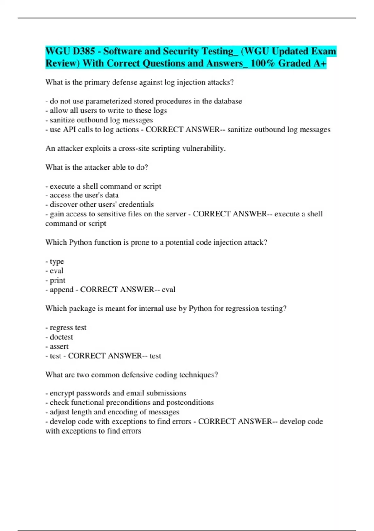 WGU D385 - Software and Security Testing_ (WGU Updated Exam Review) With Correct Questions and Answers_ 100% Graded A+