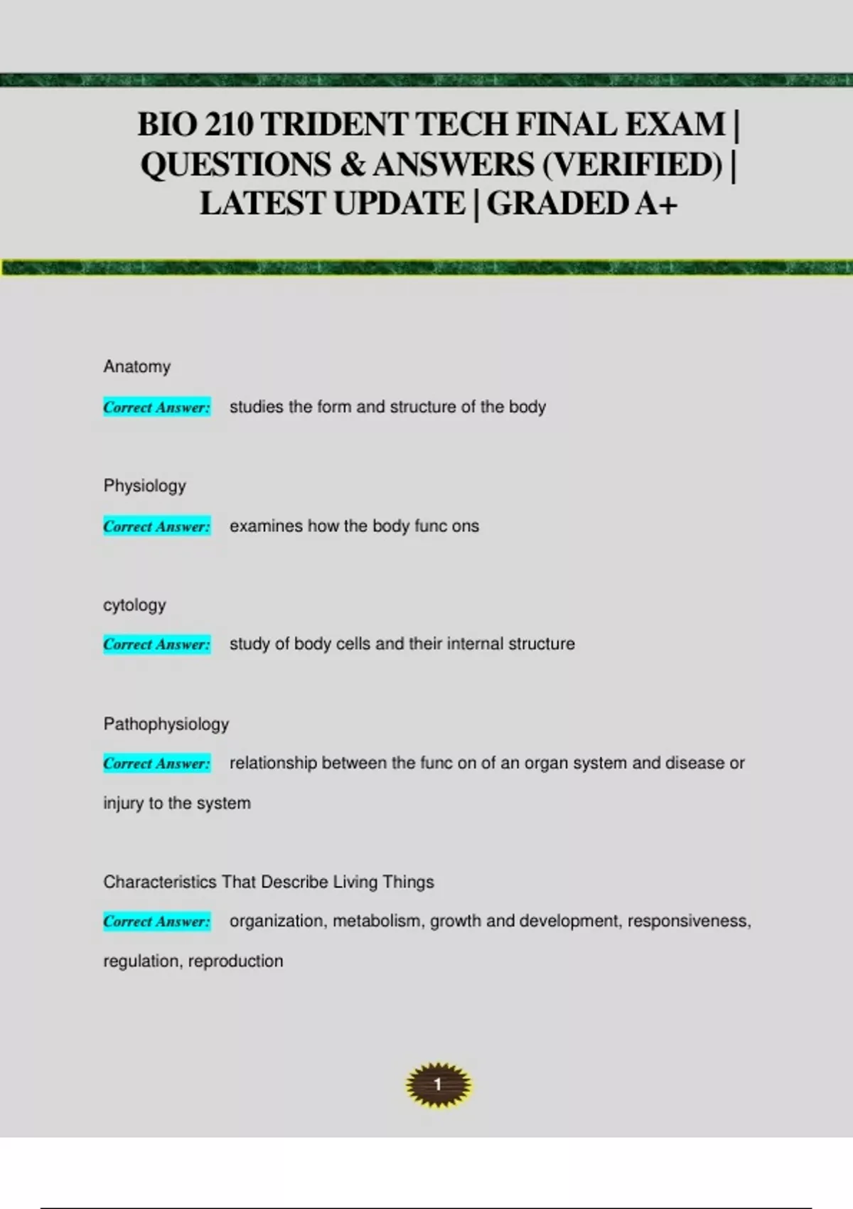 BIO 210 TRIDENT TECH FINAL EXAM | QUESTIONS & ANSWERS (VERIFIED) | LATEST UPDATE | GRADED A+