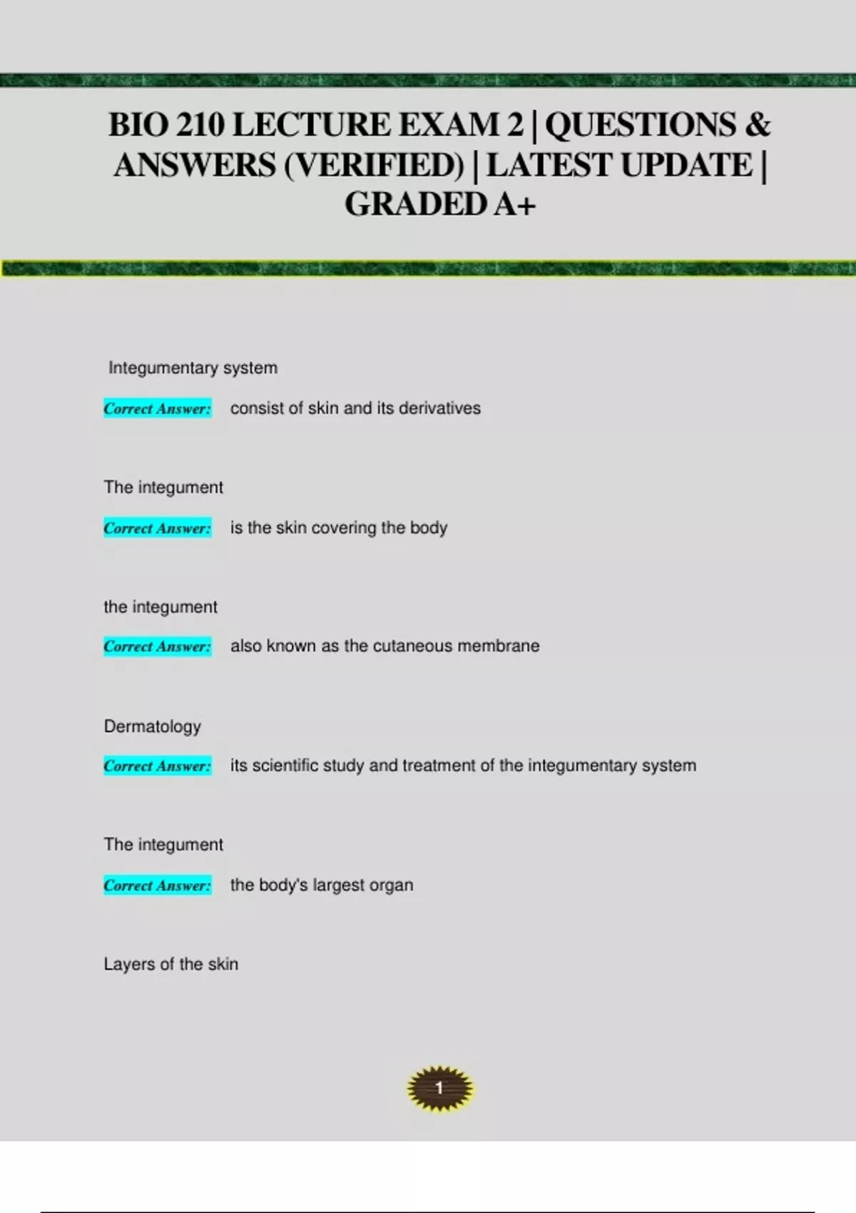 1 BIO 210 LECTURE EXAM 2 | QUESTIONS & ANSWERS (VERIFIED) | LATEST UPDATE | GRADED A+ Integumentary system Correct Answer: consist of skin and its derivatives The integument Correct Answer: is the skin covering the body the integument Correct Answer: also known as the cutaneous membrane Dermatology Correct Answer: its scientific study and treatment of the integumentary system The integument Correct Answer: the body's largest organ Layers of the skin 2 Correct Answer: epidermis, dermis, subcutaneous layer(not considered in the integument) Epidermis Correct Answer: stratified squamous epithelium Dermis Correct Answer: deep layer, primarily dense irregular connective tissue Subcutaneous layer Correct Answer: deep to dermis, Layer of areolar and other connective tissue, hypodermis or superficial fascia, Not part of the integument(true skin) but is still part of integumentary system Thick skin Correct Answer: on the palms of hands, soles of feet and surfaces of fingers and toes, All five layers of the epidermal strata, Has sweat glands thick skin Correct Answer: has no hair follicles or sebaceous glands Thin skin 3 Correct Answer: lacks a stratum lucidum, has sweat glands, hair follicles and sebaceous glands Hemoglobin Correct Answer: an oxygen binding compound, Bright red color upon binding oxygen, More visible when blood vessels dilate Melanin Correct Answer: black, brown, tan, yellow-brown shades Melanocytes Correct Answer: pigment of melanin is produced and stored here UV light Correct Answer: stimulating melanin production melanin Correct Answer: darker skinned producing more and dark colored Carotene Correct Answer: yellow, orange pigment, acquired from yellow-orange vegetables, converted to vitamin A within the body 4 Nevus Correct Answer: a mole, harmless overgrowth of melanin forming cells Freckle Correct Answer: yellowish brown spots, represent localized areas of increased melanocyte activity Hemangioma Correct Answer: skin discoloration due to benign blood vessel tumor Capillary hemangiomas Correct Answer: usually present at birth and disappear in childhood, strawberry colored birthmarks Cavernous hemangiomas Correct Answer: may last a lifetime, port-wine stains Friction ridges Correct Answer: complex arches and whorls on finger, palms, soles, and toes, formed from large folds and valleys of the dermis and epidermis, interlocking of epidermal ridges and dermal papilla, help increase fiction on contact, each individual with unique pattern of these 5 Dermis Correct Answer: deep to the epidermis, composed of connective tissue Two layersof the dermis Correct Answer: papillary and reticular layer Lines of cleavage, stretch marks, and wrinkles Correct Answer: collagen and elastic fibers oriented in parallel bundles Incisions parallel for surgery Correct Answer: more likely to heal quickly, scarring reduced Incisions perpendicular to cleavage lines for surgery Correct Answer: more likely to open due to cut elastic fibers, scarring increases Stretch marks Correct Answer: striae Dermal blood vessels Correct Answer: supply nutrients to epidermis and dermis, play an important role in body temperature and blood pressure regulation Vasoconstriction 6 Correct Answer: blood vessel diameters narrowed, look pale when exposed to cold Vasodilation Correct Answer: blood vessel diameter increased, occurs when needing to loose heat, why people become flushed during exercise Subcutaneous layer Correct Answer: not considered part of the integument, not the true skin, the layer underneath the skin Functions of the subcutaneous layer Correct Answer: acts as energy reservoir, provides thermal insulation, drugs often inject here Epidermal derivatives Correct Answer: nails, hair, exocrine glands derived from epidermal epithelium Hair is found almost everywhere on the body besides Correct Answer: the hands and palmar surface of fingers, the siders and soles of the feet and toes, the lips, portions of the external genital Three types of hair Correct Answer: lanugo, vellus, terminal 7 Lanugo hair Correct Answer: fine, un-pigmented, downy hair Vellus hair Correct Answer: fine hair, primary human hair, found on upper and lower limbs Terminal hair Correct Answer: coarser, pigmented, longer, on scalp, eyebrows, and eyelashes, men's beards, during puberty replaces vellus hair in axillary and public regions Functions of the hair Correct Answer: protection, heat retention, sensory reception, visual identification, chemical signal dispersal Disperse pheromones Correct Answer: chemical signals involved in attracting sexual partners Hair color Correct Answer: results from synthesis of melanin in the matrix adjacent to hair, reflects genetic, environmental and hormonal factors, becomes lighter with age as pigment production decreases 8 Growth rate of hair Correct Answer: one-third mm per day in the scalp for 2 to 5 years, enters formant phase of 3 to 4 months, eventually pushed out and replaced by new hair Hair loss Correct Answer: normal scalp to loss of 10-100 hairs per day Alopecia Correct Answer: thinning of hair, usually result of aging Two most common types of exocrine glands Correct Answer: sweat glands and sebaceous glands Sweat glands Correct Answer: Merocrine and apocrine glands Merocrine Correct Answer: most numerous and widely distributed sweat glands, secrete sweat sensible perspiration Correct Answer: sweating and knowing you are Insensible perspiration 9 Correct Answer: involuntary, the loss of fluid by evaporation through the stratum corneum Major function of thermoregulation Correct Answer: produce exocytosis Apocrine sweat glands Correct Answer: discharge their secretions into hair follicles, found in axillae, around nipples, in pubic and anal region, produce odor when acted on by bacteria Sebaceous glands Correct Answer: produce oily secretion called sebum Holocrine glands Correct Answer: activated during puberty Ceruminous glands Correct Answer: located only in the external acoustic auditory canal, produ
