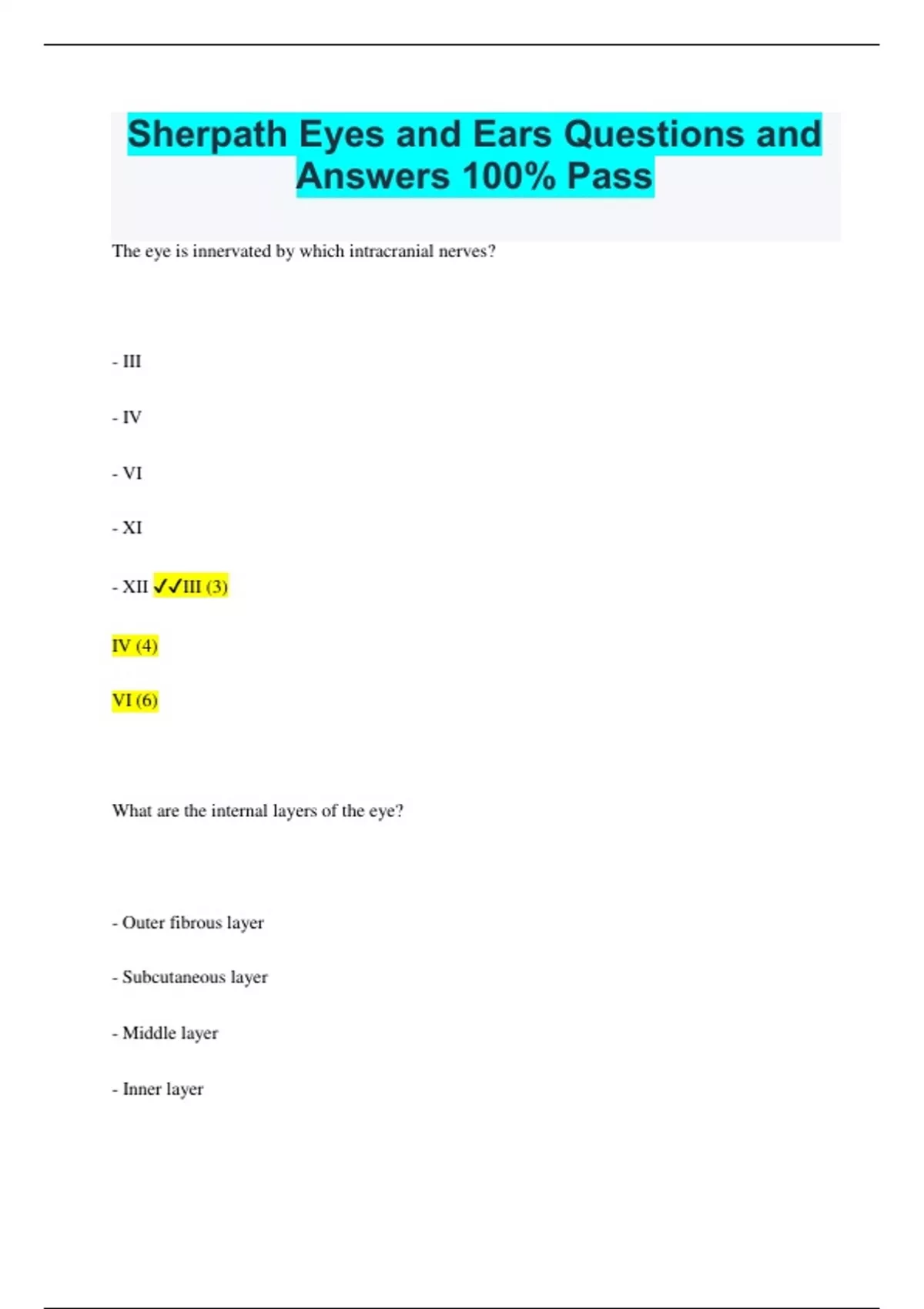 Sherpath Eyes and Ears Questions and Answers 100% Pass The eye is innervated by which intracranial nerves? - III - IV - VI - XI - XII III (3) IV (4) VI (6) What are the internal layers of the eye? - Outer fibrous layer - Subcutaneous layer - Middle layer - Inner layer - Dermal layer Outer fibrous layer Middle layer Inner layer Match the internal eye structure with the relevant function. - Supports the internal eye structures - Major part of the refractive power of the eye - Contains pigment that produces eye color - Transforms light impulses into electrical impulses - Allows images from varied distances to be focused on the retina a. cornea b. lens c. retina d. sclera e. iris *Supports the internal eye structures* Sclera *Major part of the refractive power of the eye* Cornea *Contains pigment that produces eye color* Iris *Allows images from varied distances to be focused on the retina* Lens *Transforms light impulses into electrical impulses* Retina What is the function of the pupil? a. Dilates and contracts to control the amount of light passing through to the retina b. Produces aqueous humor and contains muscles