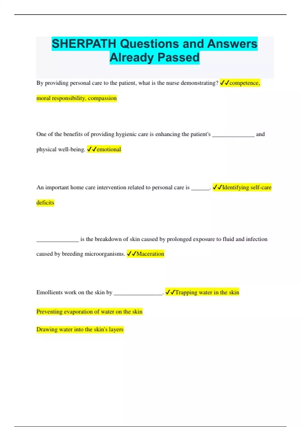 SHERPATH Questions and Answers Already Passed By providing personal care to the patient, what is the nurse demonstrating? competence, moral responsibility, compassion One of the benefits of providing hygienic care is enhancing the patient's ______________ and physical well-being. emotional An important home care intervention related to personal care is ______. Identifying self-care deficits ______________ is the breakdown of skin caused by prolonged exposure to fluid and infection caused by breeding microorganisms. Maceration Emollients work on the skin by ________________. Trapping water in the skin Preventing evaporation of water on the skin Drawing water into the skin's layers Prior to beginning any patient bathing procedure, the nurse's priority action is to________. Assess the ability of the patient to participate in the process. Which action should the nurse implement when conducting a complete bed bath for a patient? Gathering pre-packaged bed cloths Which is a nursing consideration about the patient when providing a sink bath to a patient? Can perform part of the bath independently Why is it contraindicated for a patient with peripheral neuropathy to soak the feet? Can cause tissue drying and a risk of infection Massage uses a range of techniques to promote which of the following? Relaxation Comfort Circulation Sleep A patient diagnosed with peripheral neuropathy and related circulatory impairment requires a nail-clipping. The nurse should avoid _______________ when clipping the nails of this patient. Nicks and cuts in the skin The nurse knows oral care mostly benefits the patient by___________________. Helping to prevent infections 1)Denture care is performed wearing gloves 2)Provide oral care with toothbrush, water, or moistened toothette 3)Are at risk for aspiration