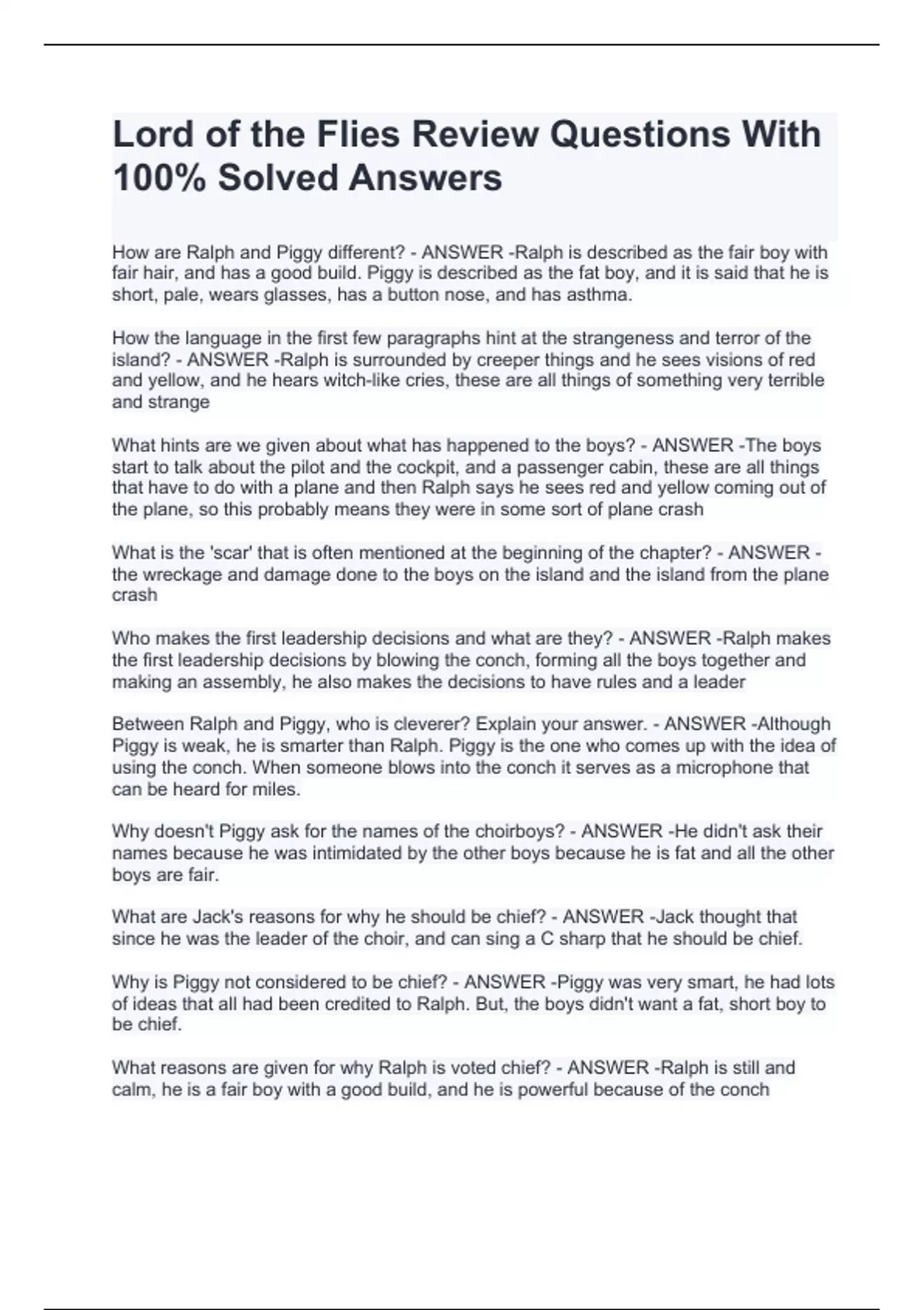 Lord of the Flies Review Questions With 100% Solved Answers