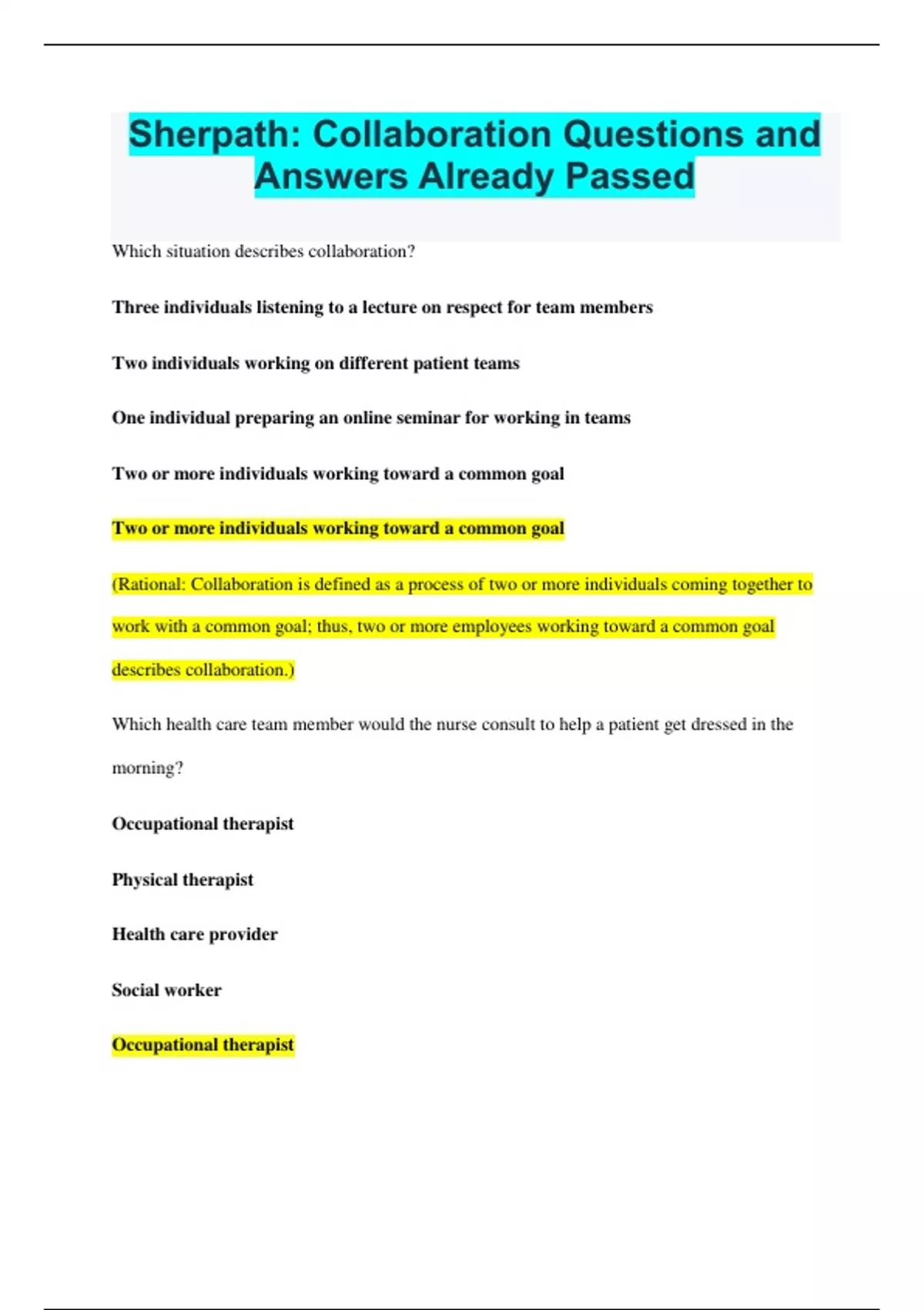 Sherpath: Collaboration Questions and Answers Already Passed Which situation describes collaboration? Three individuals listening to a lecture on respect for team members Two individuals working on different patient teams One individual preparing an online seminar for working in teams Two or more individuals working toward a common goal Two or more individuals working toward a common goal (Rational: Collaboration is defined as a process of two or more individuals coming together to work with a common goal; thus, two or more employees working toward a common goal describes collaboration.) Which health care team member would the nurse consult to help a patient get dressed in the morning? Occupational therapist Physical therapist Health care provider Social worker Occupational therapist (Rationale: The occupational therapist works directly with the patient on strategies for activities of daily living, including dressing independently.) Which information is correct about delegating care? The nurse can delegate evaluation. The nurse relies on the national nurse practice act for delegation. The nurse retains accountability for tasks delegated. The nurse avoids the scope of practice when delegating. The nurse retains accountability for tasks delegated. (Rationale: The nurse retains accountability for patient outcomes and care based on that delegation because that is a legal requirement of delegation.) Which example is one of the five rights of delegation? Right time Right direction or communication Right drug or prescription Right documentation Right direction or communication (Rationale: Right direction or communication is one of the five rights of delegation. It involves giving clear, concise instructions.) Which skills or components are needed to be an effective nurse collaborator? Select all that apply. Team building Critical thinking Communication Personal purpose Independent goal Team building (Rationale: Team building is a skill the nurse needs to be an effective collaborator because it helps build a cohesive team.) Critical thinking (Rationale: Critical thinking is a skill the nurse needs to be an effective collaborator because it insightfully determines the best course of action for the team.) Communication (Rationale: Communication is a skill the nurse needs to be an effective collaborator because it allows the nurse to interact successfully with all team members.) Which team-building skills would the nurse use to be an effective collaborator? Select all that apply. Recognizing resource limitations Starting and ending a meeting