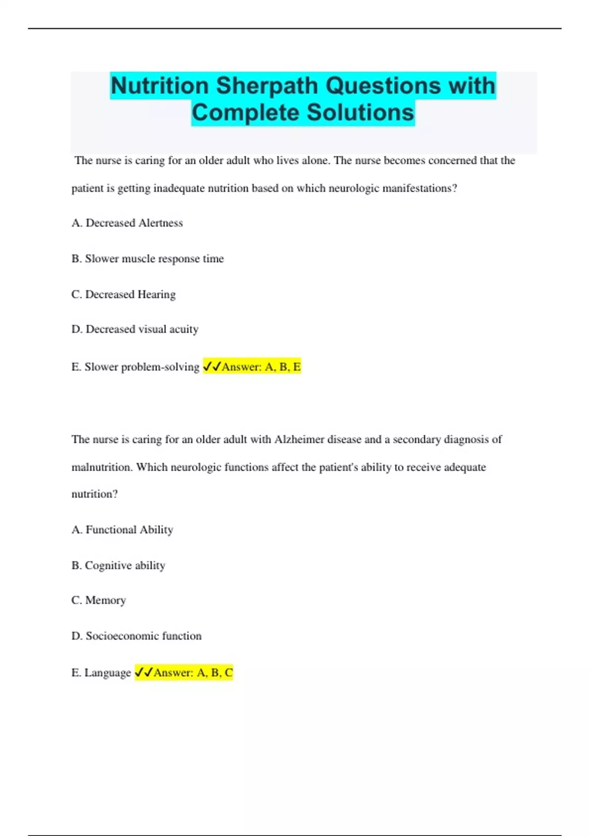 Nutrition Sherpath Questions with Complete Solutions The nurse is caring for an older adult who lives alone. The nurse becomes concerned that the patient is getting inadequate nutrition based on which neurologic manifestations? A. Decreased Alertness B. Slower muscle response time C. Decreased Hearing D. Decreased visual acuity E. Slower problem-solving Answer: A, B, E The nurse is caring for an older adult with Alzheimer disease and a secondary diagnosis of malnutrition. Which neurologic functions affect the patient's ability to receive adequate nutrition? A. Functional Ability B. Cognitive ability C. Memory D. Socioeconomic function E. Language Answer: A, B, C An adult patient is being treated in the hospital for hypertensive crisis. Which nutritional modification should the patient make immediately that can positively impact blood pressure? A. Decrease sugar B. Decrease salt C. Decrease fat. D. Decrease carbohydrates. Answer: B An athletic adolescent girl is being treated for iron deficiency anemia. Which symptoms are expected with this condition? A. weight gain B. Fatigue C. Constipation D. Dizziness E. Pale skin Answer: B, D, E A patient in the telemetry unit is recovering from a heart attack. The nurse teaches the patient that blood flow to part of the heart was occluded by plaque from which substances? A. Sodium B. Glucose C. Vitamins D. Cholesterol E. Lipids Answer: D, E Which complications may result from malabsorption? A. Poor wound healing B. Dysphagia C. weight loss D. Fatigue E. Psychological disorders Answer: A, C, D Parents of an infant diagnosed with phenylketonuria (PKU) are informed that the condition is a result of failure to metabolize amino acids after consuming which substance? A. Protein B. Fat C. Water D. Carbs Answer: A