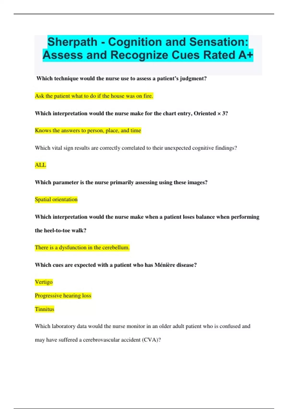 Sherpath - Cognition and Sensation: Assess and Recognize Cues Rated A+ Which technique would the nurse use to assess a patient’s judgment? Ask the patient what to do if the house was on fire. Which interpretation would the nurse make for the chart entry, Oriented × 3? Knows the answers to person, place, and time Which vital sign results are correctly correlated to their unexpected cognitive findings? ALL Which parameter is the nurse primarily assessing using these images? Spatial orientation Which interpretation would the nurse make when a patient loses balance when performing the heel-to-toe walk? There is a dysfunction in the cerebellum. Which cues are expected with a patient who has Ménière disease? Vertigo Progressive hearing loss Tinnitus Which laboratory data would the nurse monitor in an older adult patient who is confused and may have suffered a cerebrovascular accident (CVA)? ALL Which rating would the nurse assign to a patient who has a slightly hyperactive response to the patellar reflex? 3+ Which finding is an expected response of the Babinski reflex? Plantarflexion of the toes Which cranial nerve is affected if the patient has anosmia? I Which patient situations are of immediate concern? Becomes restless Begins to slur words Begins to act confused Suddenly has drooping on left side of face Which cues are associated with Alzheimer disease? Wandering Sundowning Memory loss Repetitive behaviors Which cranial nerve is affected in sensorineural hearing loss? VIII Which impairment is a patient with a recent cerebrovascular accident (CVA) experiencing when able to follow commands but has difficulty responding verbally? Expressive aphasia The nurse understands that peripheral neuropathy occurs from damage to sensory fibers at which location? Away from the body's center Which cues would the nurse likely observe in a patient with a cerebrovascular accident (CVA)? Elevated triglycerides Aphasia