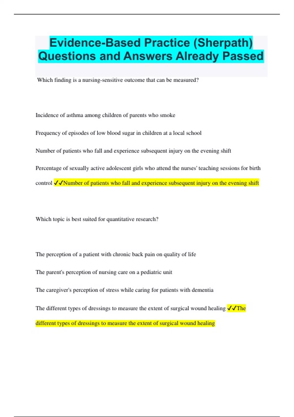 Evidence-Based Practice (Sherpath) Questions and Answers Already Passed Which finding is a nursing-sensitive outcome that can be measured? Incidence of asthma among children of parents who smoke Frequency of episodes of low blood sugar in children at a local school Number of patients who fall and experience subsequent injury on the evening shift Percentage of sexually active adolescent girls who attend the nurses' teaching sessions for birth control Number of patients who fall and experience subsequent injury on the evening shift Which topic is best suited for quantitative research? The perception of a patient with chronic back pain on quality of life The parent's perception of nursing care on a pediatric unit The caregiver's perception of stress while caring for patients with dementia The different types of dressings to measure the extent of surgical wound healing The different types of dressings to measure the extent of surgical wound healing Which element is described when the researcher provides complete information about the purpose of the study and gives patients the choice to participate or not participate in the study? Bias Anonymity Confidentiality Informed consent Informed consent The terms "diagnosis of breast cancer" and "roles of the family" are examples of which elements in the research question, "What is the effect of the diagnosis of breast cancer on the roles of the family?" Surveys The sample Variables Data collection The sample Which element does the C stand for in a PICOT question? Comparison of interest Client who is admitted Care provided Current diagnosis Comparison of interest Which type of research study represents the nurse designing and conducting an informational health campaign and then measuring the outcomes of the campaign? Evaluation Descriptive Exploratory Experimental Evaulation Which type of research study describes when the nurse researcher randomly assigns 100 patients who smoke and attend a wellness clinic into two groups and plans to compare the effectiveness of the standard treatment with the educational program? Qualitative Descriptive Correlational Randomized controlled trial Randomized controlled trial Which activity regarding the research process would the nurse conduct to determine what has already been studied about the research problem of interest? Construct a theoretical framework Identify variables Formulate a hypothesis