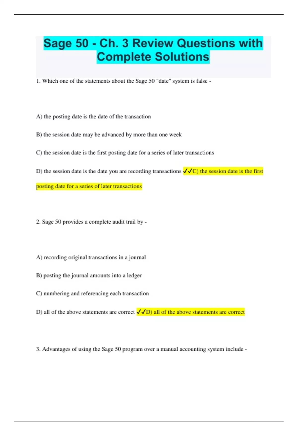 Sage 50 - Ch. 3 Review Questions with Complete Solutions 1. Which one of the statements about the Sage 50 "date" system is false - A) the posting date is the date of the transaction B) the session date may be advanced by more than one week C) the session date is the first posting date for a series of later transactions D) the session date is the date you are recording transactions C) the session date is the first posting date for a series of later transactions 2. Sage 50 provides a complete audit trail by - A) recording original transactions in a journal B) posting the journal amounts into a ledger C) numbering and referencing each transaction D) all of the above statements are correct D) all of the above statements are correct 3. Advantages of using the Sage 50 program over a manual accounting system include - A) Sage 50 creates jobs because it requires more individuals to key in data B) through recording journal entries, all ledgers and reports are up to date C) you are unable to set reminders "daily business manager lists" for reports, etc. D) choices a and c are correct B) through recording journal entries, all ledgers and reports are up to date 4. The general journal input screen will not allow you to post a transaction - A) unless the debit amounts exceed the credit amounts B) unless the credit amounts exceed the debit amounts C) unless the debit amounts are equal to the credit amounts D) unless you choose to display the general journal entry first C) unless the debit amounts are equal to the credit amounts 5. A purchase of supplies for $2,000 plus $100 GST in the general journal would not be posted - A) if the Supplies and GST were recorded as credits and Accounts Payable as debits B) if the GST was omitted and the Accounts Payable credit was $2,000 C) if the GST was omitted, Supplies debit was $2,100 and Accounts Payable credit was $2,100 D) if the debit amounts did not equal the credit amounts D) if the debit amounts did not equal the credit amounts 6. A variety of reports and financial statements may be viewed by - A) selecting the reports menu and opening the appropriate choice B) selecting the file menu and opening the appropriate choice C) selecting the view menu and opening the appropriate choice D) selecting the graphs menu and opening the appropriate choice A) selecting the reports menu and opening the appropriate choice 7. Which one of the following general statements is incorrect - A) you cannot post an entry if debits do not balance credits B) you must post an entry in order to review or display it C) displaying your general journal entry may uncover