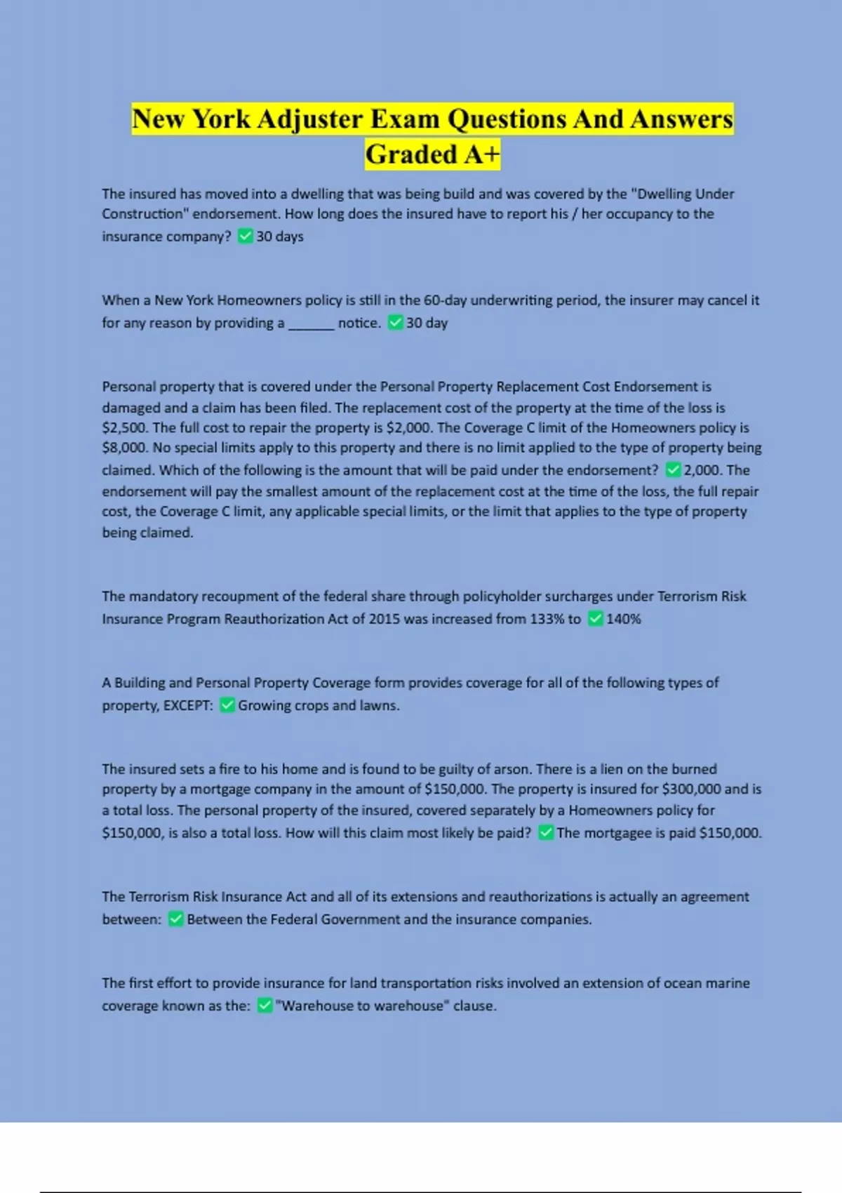 New York Adjuster Exam Questions And Answers Graded A+ New York Adjuster Exam Questions And Answers Graded A+