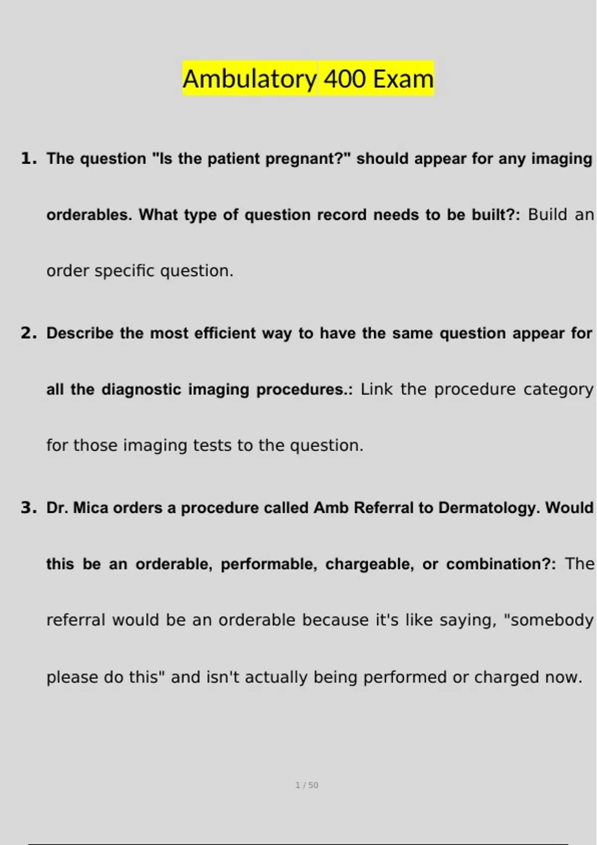 1. The question "Is the patient pregnant?" should appear for any imaging orderables. What type of question record needs to be built?: Build an order specific question. 2. Describe the most efficient way to have the same question appear for all the diagnostic imaging procedures.: Link the procedure category for those imaging tests to the question. 3. Dr. Mica orders a procedure called Amb Referral to Dermatology. Would this be an orderable, performable, chargeable, or combination?: The referral would be an orderable because it's like saying, "somebody please do this" and isn't actually being performed or charged now.