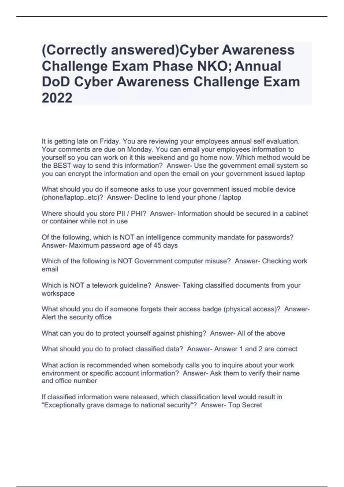 (CORRECTLY ANSWERED)CYBER AWARENESS CHALLENGE EXAM PHASE NKO; ANNUAL DOD CYBER AWARENESS CHALLENGE EXAM 2024