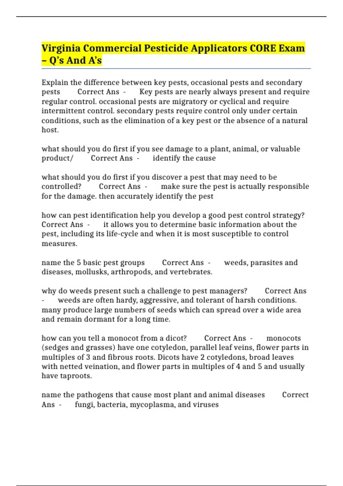 Virginia Commercial Pesticide Applicators CORE Exam – Q’s And A’s