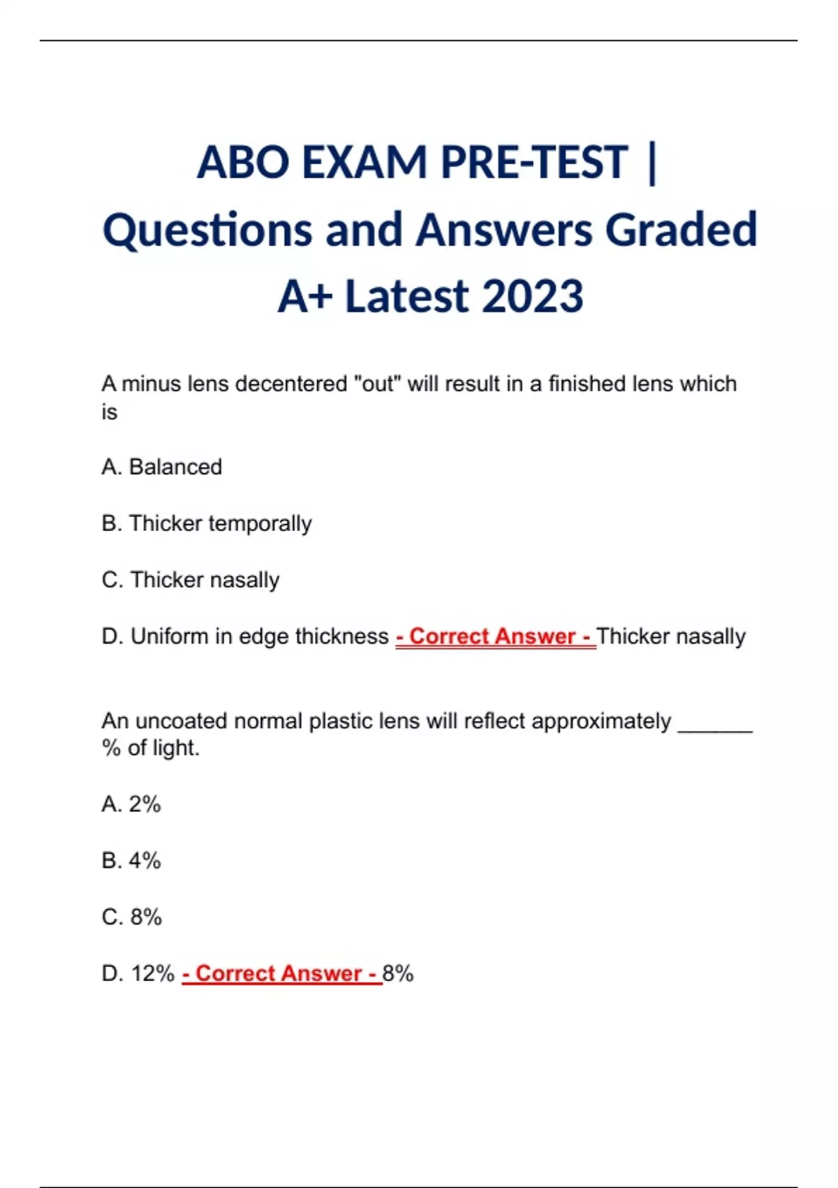 ABO EXAM PRE-TEST | Questions and Answers Graded A+ Latest 2023 ABO EXAM PRE-TEST | Questions and Answers Graded A+ Latest 2023 ABO EXAM PRE-TEST | Questions and Answers Graded A+ Latest 2023