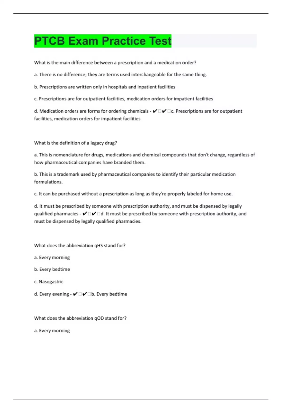 What is the main difference between a prescription and a medication order? a. There is no difference; they are terms used interchangeable for the same thing. b. Prescriptions are written only in hospitals and inpatient facilities c. Prescriptions are for outpatient facilities, medication orders for impatient facilities d. Medication orders are forms for ordering chemicals - ️️c. Prescriptions are for outpatient facilities, medication orders for impatient facilities What is the definition of a legacy drug? a. This is nomenclature for drugs, medications and chemical compounds that don't change, regardless of how pharmaceutical companies have branded them. b. This is a trademark used by pharmaceutical companies to identify their particular medication formulations. c. It can be purchased without a prescription as long as they're properly labeled for home use. d. It must be prescribed by someone with prescription authority, and must be dispensed by legally qualified pharmacies - ️️d. It must be prescribed by someone with prescription authority, and must be dispensed by legally qualified pharmacies. What does the abbreviation qHS stand for? a. Every morning b. Every bedtime c. Nasogastric d. Every evening - ️️b. Every bedtime What does the abbreviation qOD stand for? a. Every morning