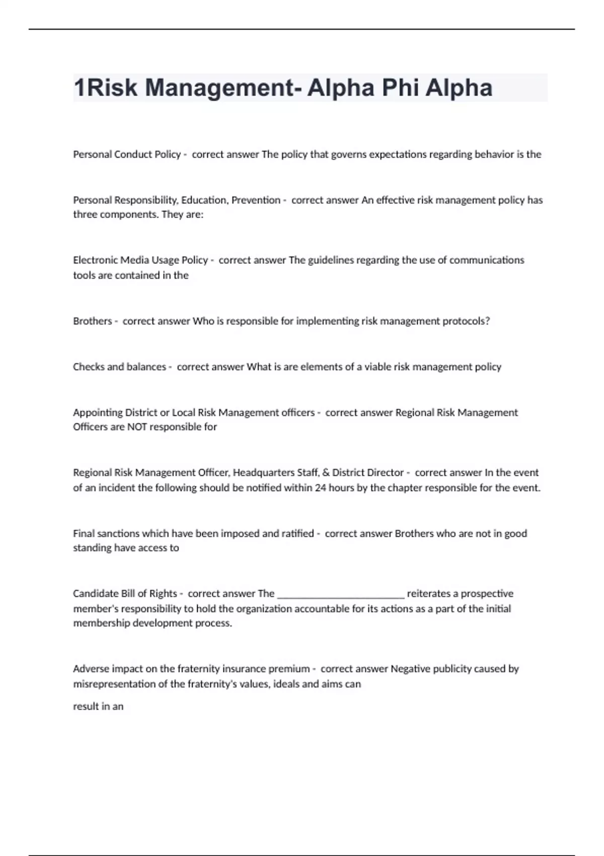 1Risk Management- Alpha Phi AlphaPersonal Conduct Policy - correct answer The policy that governs expectations regarding behavior is the Personal Responsibility, Education, Prevention - correct answer An effective risk management policy has three components. They are: Electronic Media Usage Policy - correct answer The guidelines regarding the use of communications tools are contained in the Brothers - correct answer Who is responsible for implementing risk management protocols? Checks and balances - correct answer What is are elements of a viable risk management policy Appointing District or Local Risk Management officers - correct answer Regional Risk Management Officers are NOT responsible for Regional Risk Management Officer, Headquarters Staff, & District Director - correct answer In the event of an incident the following should be notified within 24 hours by the chapter responsible for the event. Final sanctions which have been imposed and ratified - correct answer Brothers who are not in good standing have access to Candidate Bill of Rights - correct answer The _______________________ reiterates a prospective member's responsibility to hold the organization accountable for its actions as a part of the initial membership development process. Adverse impact on the fraternity insurance premium - correct answer Negative publicity caused by misrepresentation of the fraternity's values, ideals and aims can result in an