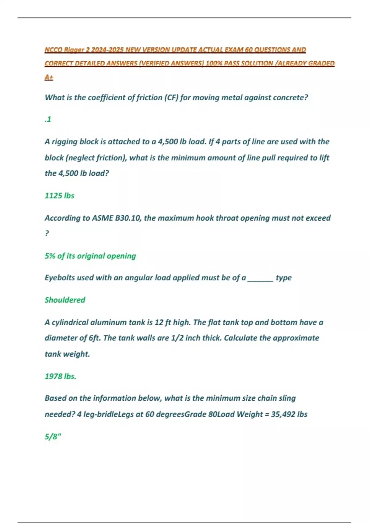 NCCO Rigger NEW VERSION UPDATE ACTUAL EXAM 60 QUESTIONS AND CORRECT DETAILED ANSWERS (VERIFIED ANSWERS) 100% PASS SOLUTION /ALREADY GRADED A+