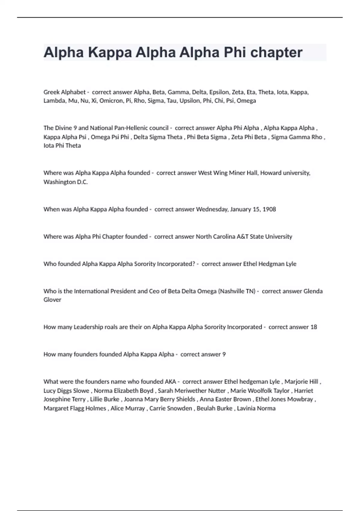 Alpha Kappa Alpha Alpha Phi chapterGreek Alphabet - correct answer Alpha, Beta, Gamma, Delta, Epsilon, Zeta, Eta, Theta, Iota, Kappa, Lambda, Mu, Nu, Xi, Omicron, Pi, Rho, Sigma, Tau, Upsilon, Phi, Chi, Psi, Omega The Divine 9 and National Pan-Hellenic council - correct answer Alpha Phi Alpha , Alpha Kappa Alpha , Kappa Alpha Psi , Omega Psi Phi , Delta Sigma Theta , Phi Beta Sigma , Zeta Phi Beta , Sigma Gamma Rho , Iota Phi Theta Where was Alpha Kappa Alpha founded - correct answer West Wing Miner Hall, Howard university, Washington D.C. When was Alpha Kappa Alpha founded - correct answer Wednesday, January 15, 1908 Where was Alpha Phi Chapter founded - correct answer North Carolina A&T State University Who founded Alpha Kappa Alpha Sorority Incorporated? - correct answer Ethel Hedgman Lyle Who is the International President and Ceo of Beta Delta Omega (Nashville TN) - correct answer Glenda Glover How many Leadership roals are their on Alpha Kappa Alpha Sorority Incorporated - correct answer 18 How many founders founded Alpha Kappa Alpha - correct answer 9 What were the founders name who founded AKA - correct answer Ethel hedgeman Lyle , Marjorie Hill , Lucy Diggs Slowe , Norma Elizabeth Boyd , Sarah Meriwether Nutter , Marie Woolfolk Taylor , Harriet Josephine Terry , Lillie Burke , Joanna Mary Berry Shields , Anna Easter Brown , Ethel Jones Mowbray , Margaret Flagg Holmes , Alice Murray , Carrie Snowden , Beulah Burke , Lavinia Norma