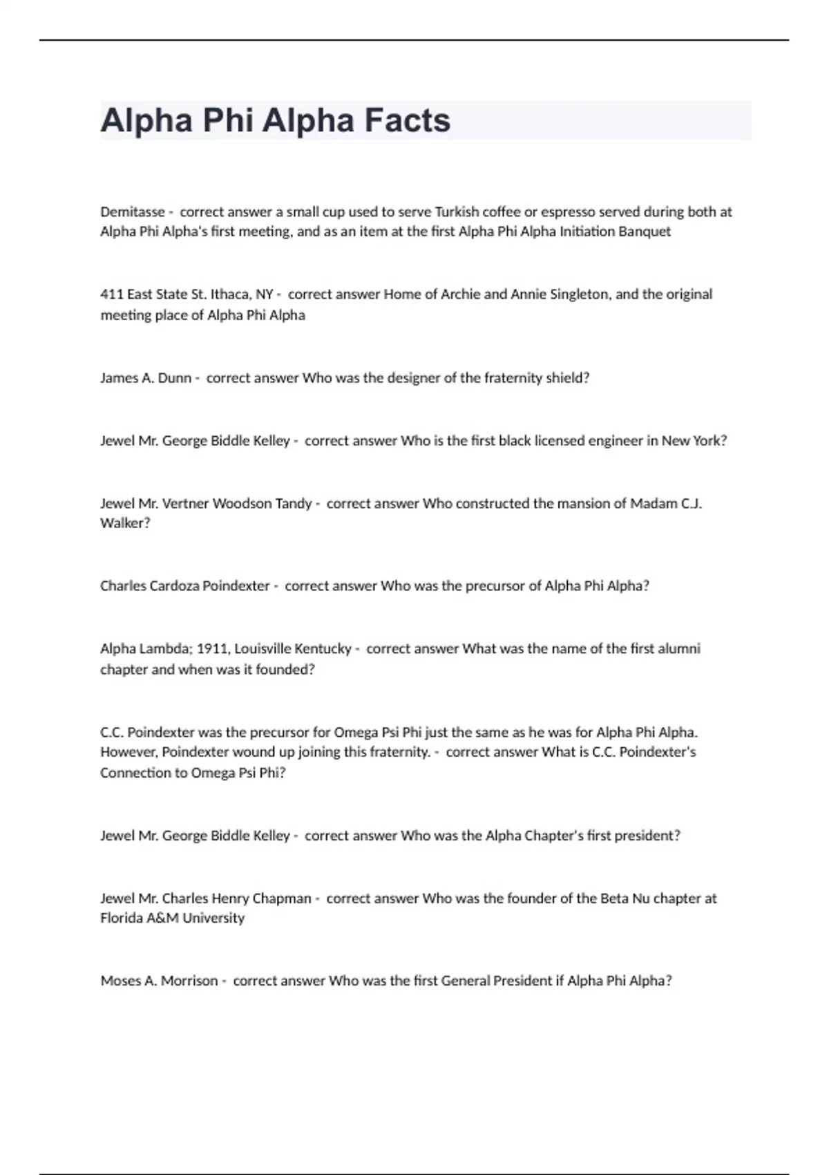 Alpha Phi Alpha FactsDemitasse - correct answer a small cup used to serve Turkish coffee or espresso served during both at Alpha Phi Alpha's first meeting, and as an item at the first Alpha Phi Alpha Initiation Banquet 411 East State St. Ithaca, NY - correct answer Home of Archie and Annie Singleton, and the original meeting place of Alpha Phi Alpha James A. Dunn - correct answer Who was the designer of the fraternity shield? Jewel Mr. George Biddle Kelley - correct answer Who is the first black licensed engineer in New York? Jewel Mr. Vertner Woodson Tandy - correct answer Who constructed the mansion of Madam C.J. Walker? Charles Cardoza Poindexter - correct answer Who was the precursor of Alpha Phi Alpha? Alpha Lambda; 1911, Louisville Kentucky - correct answer What was the name of the first alumni chapter and when was it founded? C.C. Poindexter was the precursor for Omega Psi Phi just the same as he was for Alpha Phi Alpha. However, Poindexter wound up joining this fraternity. - correct answer What is C.C. Poindexter's Connection to Omega Psi Phi? Jewel Mr. George Biddle Kelley - correct answer Who was the Alpha Chapter's first president? Jewel Mr. Charles Henry Chapman - correct answer Who was the founder of the Beta Nu chapter at Florida A&M University