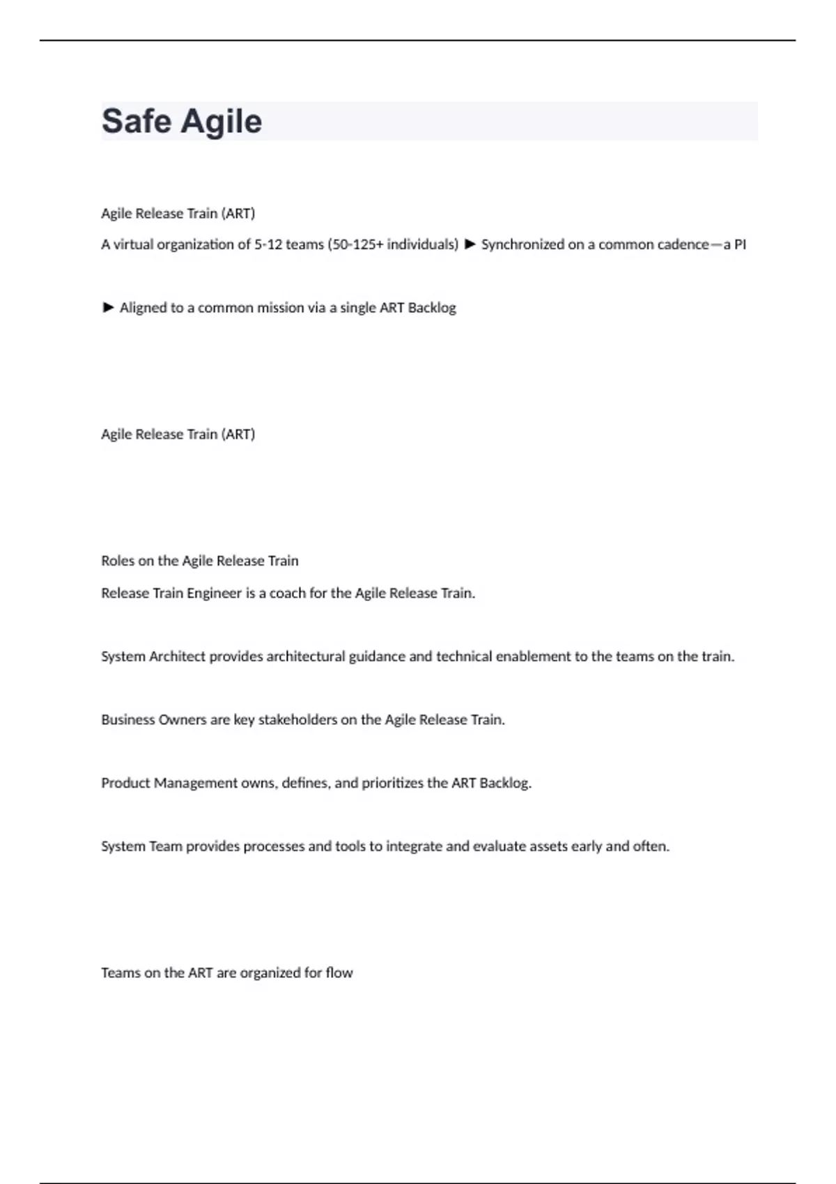 Safe Agile Agile Release Train (ART) A virtual organization of 5-12 teams (50-125+ individuals) ► Synchronized on a common cadence—a PI ► Aligned to a common mission via a single ART Backlog Agile Release Train (ART) Roles on the Agile Release Train Release Train Engineer is a coach for the Agile Release Train. System Architect provides architectural guidance and technical enablement to the teams on the train. Business Owners are key stakeholders on the Agile Release Train. Product Management owns, defines, and prioritizes the ART Backlog. System Team provides processes and tools to integrate and evaluate assets early and often. Teams on the ART are organized for flow