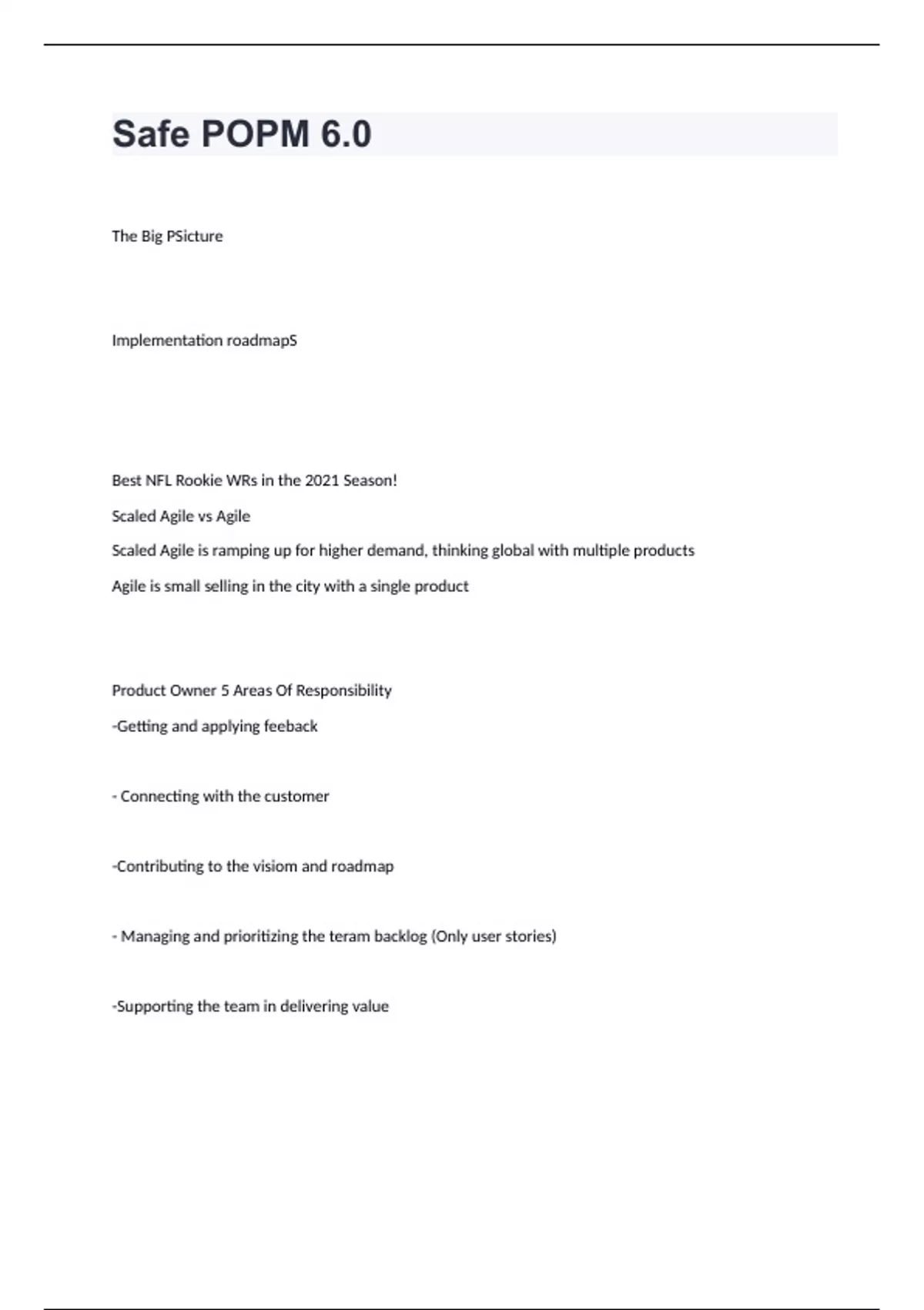 Safe POPM 6.0The Big PSicture Implementation roadmapS Best NFL Rookie WRs in the 2021 Season! Scaled Agile vs Agile Scaled Agile is ramping up for higher demand, thinking global with multiple products Agile is small selling in the city with a single product Product Owner 5 Areas Of Responsibility -Getting and applying feeback - Connecting with the customer -Contributing to the visiom and roadmap - Managing and prioritizing the teram backlog (Only user stories) -Supporting the team in delivering value