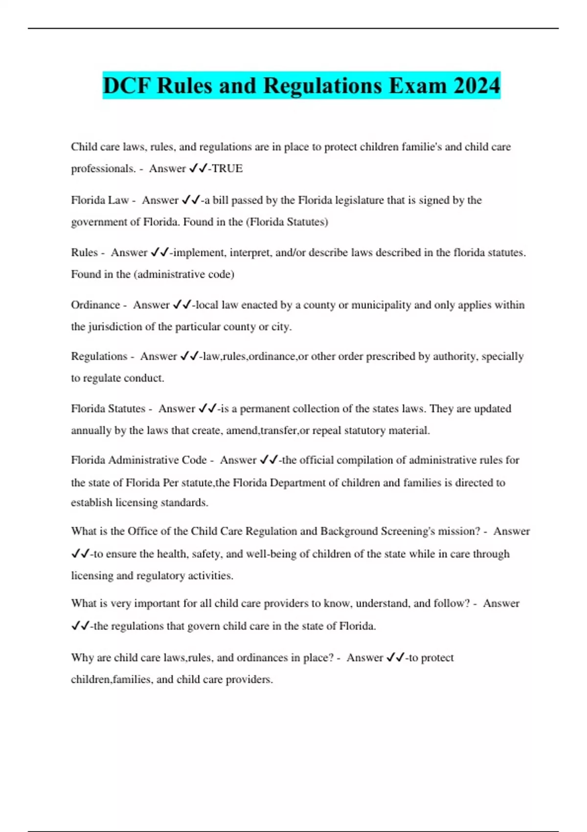 DCF Rules and Regulations Exam 2024 Child care laws, rules, and regulations are in place to protect children familie's and child care professionals. - Answer ️️ -TRUE Florida Law - Answer ️️ -a bill passed by the Florida legislature that is signed by the government of Florida. Found in the (Florida Statutes) Rules - Answer ️️ -implement, interpret, and/or describe laws described in the florida statutes. Found in the (administrative code) Ordinance - Answer ️️ -local law enacted by a county or municipality and only applies within the jurisdiction of the particular county or city. Regulations - Answer ️️ -law,rules,ordinance,or other order prescribed by authority, specially to regulate conduct. Florida Statutes - Answer ️️ -is a permanent collection of the states laws. They are updated annually by the laws that create, amend,transfer,or repeal statutory material. Florida Administrative Code - Answer ️️ -the official compilation of administrative rules for the state of Florida Per statute,the Florida Department of children and families is directed to establish licensing standards. What is the Office of the Child Care Regulation and Background Screening's mission? - Answer ️️ -to ensure the health, safety, and well-being of children of the state while in care through licensing and regulatory activities. What is very important for all child care providers to know, understand, and follow? - Answer ️️ -the regulations that govern child care in the state of Florida. Why are child care laws,rules, and ordinances in place? - Answer ️️ -to protect children,families, and child care providers. What is the Florida Department of Children and Families ? - Answer ️️ -this agency determines state rules pertaining to child care and enforces these rules by licensing and inspecting child care facilities. What are Local Fire Departments and/or Certified Fire Safety Inspectors? - Answer ️️ -this organization conducts the annual fire safety inspection and educates child care providers about minimizing fires and other threats to safety. What are County Agencies? - Answer ️️ -governmental organizations that ensure compliance with building and zoning codes including septic capacity. What are Local Licensing Agencies? - Answer ️️ -these organizations found in some counties, regulate and enforce rules and local ordinances which must meet or exceed state standards. Who benefits from The Florida Department of Child Care Regulations? - Answer ️️ -the children of Florida