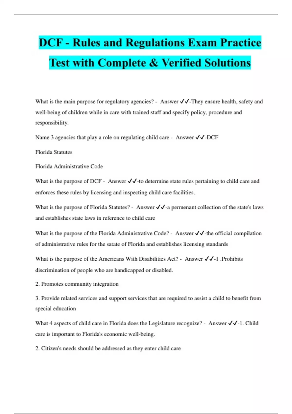 DCF - Rules and Regulations Exam Practice Test with Complete & Verified Solutions What is the main purpose for regulatory agencies? - Answer ️️ -They ensure health, safety and well-being of children while in care with trained staff and specify policy, procedure and responsibility. Name 3 agencies that play a role on regulating child care - Answer ️️ -DCF Florida Statutes Florida Administrative Code What is the purpose of DCF - Answer ️️ -to determine state rules pertaining to child care and enforces these rules by licensing and inspecting child care facilities. What is the purpose of Florida Statutes? - Answer ️️ -a permenant collection of the state's laws and establishes state laws in reference to child care What is the purpose of the Florida Administrative Code? - Answer ️️ -the official compilation of administrative rules for the satate of Florida and establishes licensing standards What is the purpose of the Americans With Disabilities Act? - Answer ️️ -1 .Prohibits discrimination of people who are handicapped or disabled. 2. Promotes community integration 3. Provide related services and support services that are required to assist a child to benefit from special education What 4 aspects of child care in Florida does the Legislature recognize? - Answer ️️ -1. Child care is important to Florida's economic well-being. 2. Citizen's needs should be addressed as they enter child care 3. Parent's need for quality care 4. Profession is to keep children safe, healthy and educated. What is child care? - Answer ️️ -The care, protection and supervision of a child for a period less than 24 hours a day on a regular basis Where can you find information about rules and regulations about child care in Florida? - Answer ️️ -DCF website: What is a Florida Law? - Answer ️️ -a bill passed by the Florida legislature that is signed by the governor of FLorida Rules - Answer ️️ -implement, interpret and describe laws found in the Florida Statutes. Ordinance - Answer ️️ -a piece of legislation that is passed at the local le